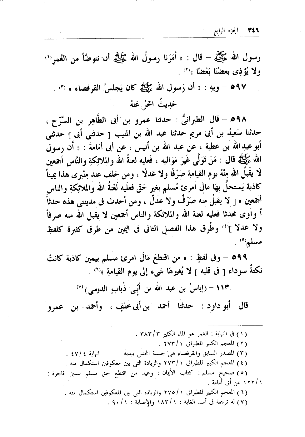 598 - قال الطبراني: حدثنا عمرو بن أبي الطاهر بن السَّرْح، حدثنا سعيدٌ بن أبي مريم حدثنا عبد الله بن المنيب [حدثني أبي] حدثني أبو عبد الله بن عطية، عن عبد الله بن أنيس، عن أبي أمامة: (أن رسول الله - صلى الله عليه وسلم - قال: من تولى غير مواليه، فعليه لعنة الله والملائكة والناس أجمعين لا يقبل الله منهُ يوم القيامة صرفاً ولا عدلاً، ومن حلف عند منبري هذا يميناً كاذبة يستحلُّ بها مال امرئ مسلمٍ بغير حق فعليه لعنة الله والملائكة والناس أجمعين) [لا يقبلُ منه صرفٌ ولا عدلٌ، ومن أحدث في مدينتي هذه حدثاً أو آوى محدثاً فعليه لعنة الله والملائكة والناس أجمعين لا يقبل الله منه صرفاً ولا عدلاً] (¬2) وطُرق هذا الفصل الثاني في اليمين من طرق كثيرة كلفظ مسلمٍ (¬3) .