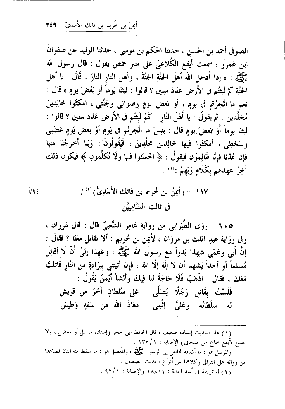 605 - روى الطبراني من رواية عامر الشعبي قال: قال مروان، وفي رواية عبد الملك بن مروان، لأيمن بن خُريمٍ: ألا تقاتل معنا؟ فقال: إنَّ أبي وعمي شهدا بدراً مع رسول الله - صلى الله عليه وسلم -، وعهدا إليَّ أن لا أقاتل مُسلماً أو أحداً يشهدُ أن لا إله إلا الله، فإن أتيتني ببراءةٍ من النار قاتلتُ معك، فقال: اذهب فلا حاجة لنا فيك وأنْشأ أيْمنُ يقولُ: