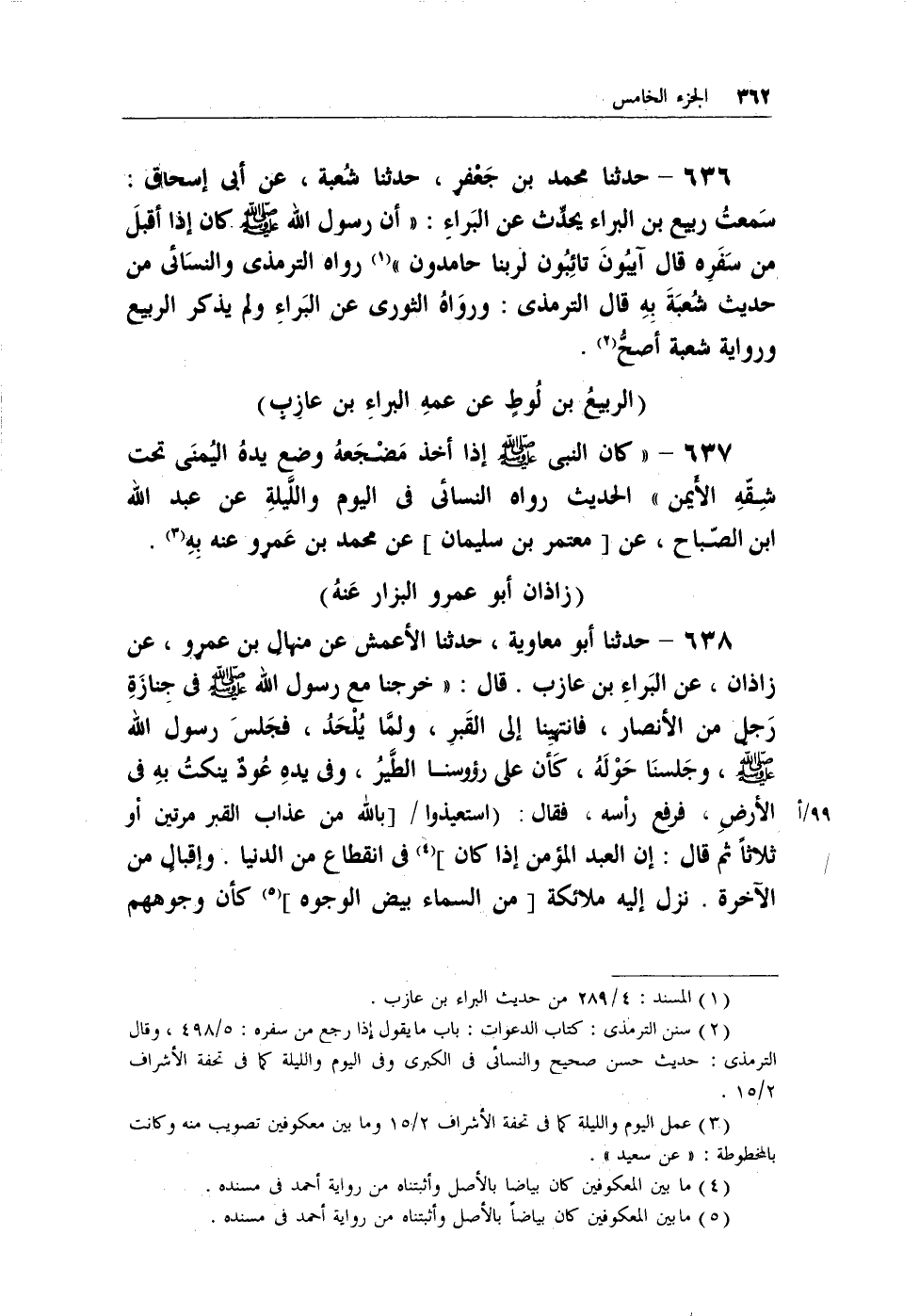 636 - حدثنا محمد بن جعفر، حدثنا شُعبة، عن أبي إسحاق: سمعتُ ربيع ابن البراء يحدث عن البراء: (أن رسول الله - صلى الله عليه وسلم - كان إذا أقبل من سفرهِ قال آيبُون تائبُون لربنا حامدون) (¬1) رواه الترمذي والنسائي من حديث شعبة بهِ قال الترمذي: ورواهُ الثوري عن البراء ولم يذكر الربيع ورواية شعبة أصحُّ (¬2) .