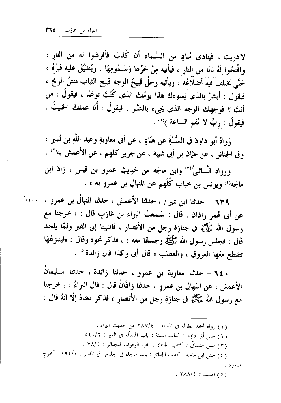 639 - حدثنا ابن نمير/، حدثنا الأعمش، حدثنا المنهالُ بن عمرو، عن أبي عُمر زاذان. قال: سمعتُ البراء بن عازبٍ قال: (خرجنا مع رسول الله - صلى الله عليه وسلم - في جنازة رجل من الأنصار، فانتيهنا إلى القبر ولما يلحد قال: فجلس رسول الله - صلى الله عليه وسلم - وجلسنا معه) ، فذكر نحوه وقال: (فينتزعها تتقطع معها العروق، والعصب) قال أبي وكذا قال زائدة (¬1) .