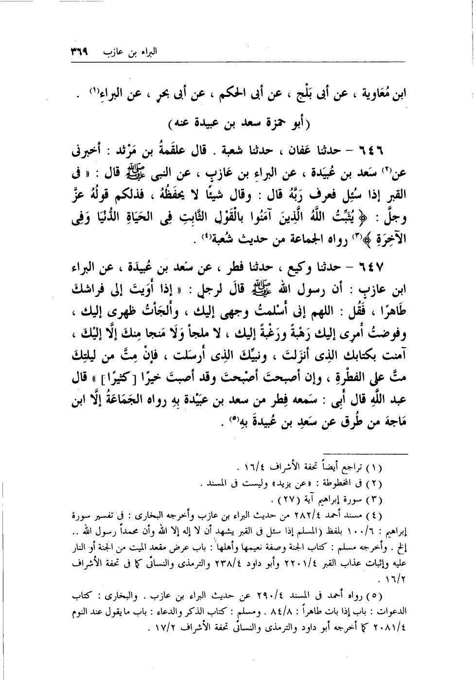 (¬3) مسند أحمد 4/282 من حديث البراء بن عازب وأخرجه البخاري: في تفسيره سورة إبراهيم: 6/100 بلفظ (المسلم إذا سئل في القبر يشهد أن لا إله إلا الله وأن محمداً رسول الله.. إلخ. وأخرجه مسلم: كتاب الجنة وصفة نعيمها وأهلها: باب عرض مقعد الميت من الجنة أو النار عليه وإثبات عذاب القبر 4/2201 وأبو داود 4/238 والترمذي والنسائي كما في تحفة الأشراف 2/16.