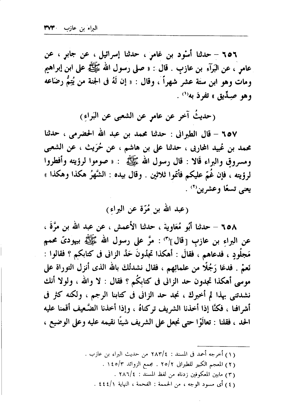 658 - حدثنا أبُومُعاوية، حدثنا الأعمش، عن عبد الله بن مرة، عن البراء ابن عازب [قال] (¬3) : مرَّ على رسول الله - صلى الله عليه وسلم - بيهودي محمم (¬4) ٍ مجلُودٍ، فدعاهم، فقال: أهكذا تجدُوني حدَّ الزاني في كتابكم؟ فقالوا: نعمْ. فدعا رجُلاً من علمائهم، فقال نشدتُكَ بالله الذي أنزل التوراة على موسى أهكذا تجدون حد الزاني في كتابِكُم؟ فقال: لا والله، ولولا أنك نشدتني بهذا لم أخبرك، نجد حد الزاني في كتابنا الرجم، ولكنه كثر في أشرافنا، فكنَّا إذا أخذنا الشريف تركناهُ، وإذا أخذنا الضَّعيف أقمنا عليه الحد، فقلنا: تعالوا حتى نجعل على الشريف شيئاً نقيمه عليه وعلى الوضيع،