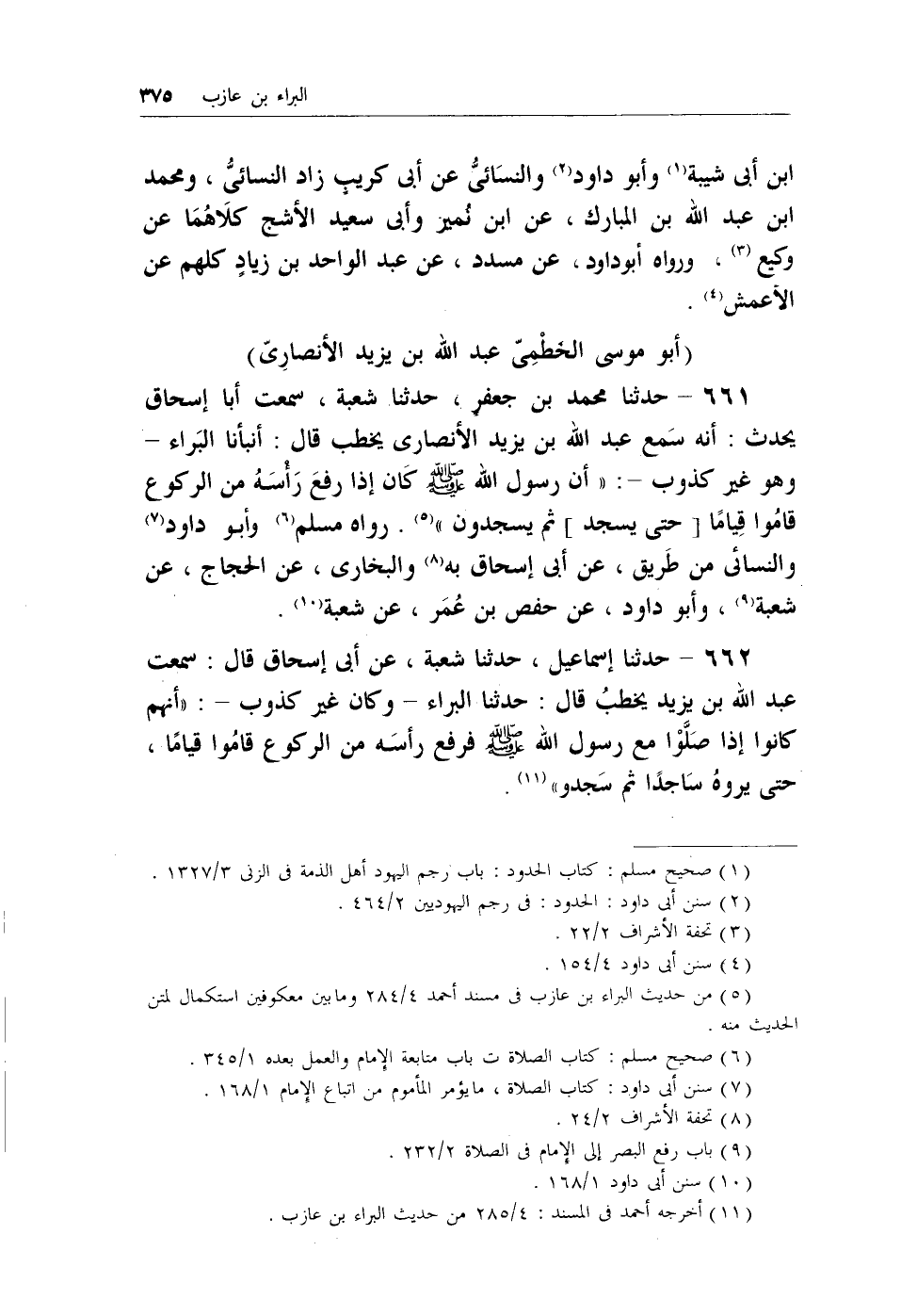 661 - حدثنا محمد بن جعفرٍ، حدثنا شعبة، سمعت أبا إسحاق يحدث: أنه سمع عبد الله بن يزيد الأنصاري يخطب قال: أنبأنا البراء - وهو غير كذوب -: (أن رسول الله - صلى الله عليه وسلم - كان إذا رفع رأْسهُ من الركوع قاموا قياماً [حتى يسجد] ثم يسجدون) (¬1) . رواه مسلم (¬2) وأبو داود (¬3) والنسائي من طريق، عن أبي إسحاق به (¬4) والبخاري، عن الحجاج، عن شعبة (¬5) ، وأبو داود، عن حفص بن عُمر، عن شعبة (¬6) .