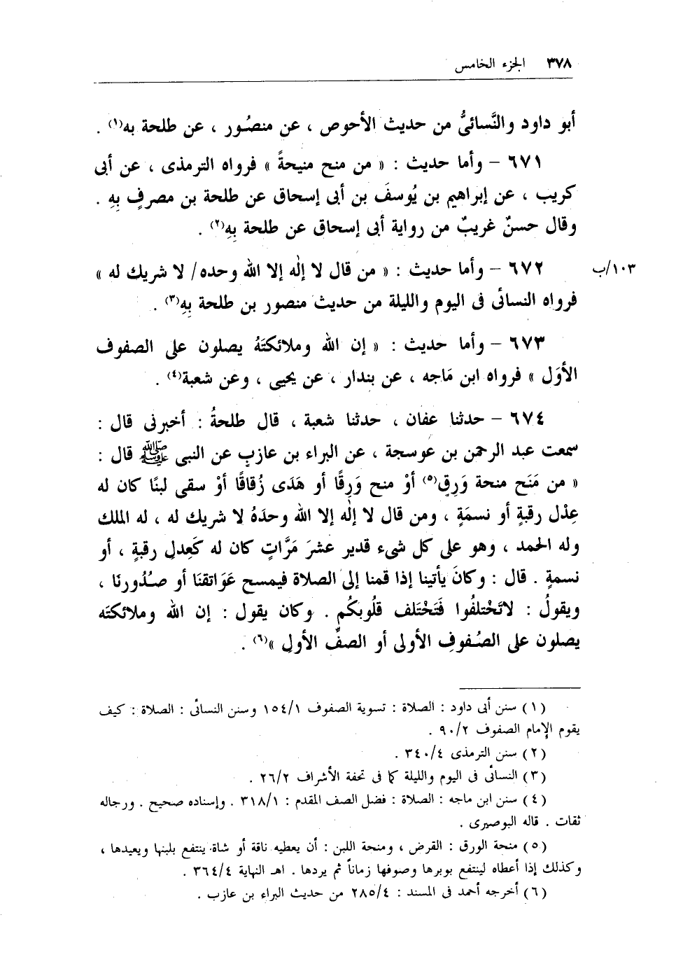 674 - حدثنا عفان، حدثنا شعبة، قال طلحةُ: أخبرني قال: سمعت عبد الرحمن بن عوسجة، عن البراء بن عازبٍ عن النبي - صلى الله عليه وسلم - قال: (من منح منحة ورقٍ (¬4) أو منح ورقاً أو هَدَى زُقاقاً أو سقى لبناً كان له عدل رقبةٍ أو نسمةٍ، ومن قال لا إله إلا الله وحدهُ لا شريك له، له الملك وله الحمد، وهو على كل شئ قدير عشر مراتٍ كان له كعدلِ رقبةٍ، أو نسمةٍ. قال: وكان يأتينا إذا قمنا إلى الصلاة فيمسح عواتقنا أو صدُورنَا، ويقولُ: لا تختلفُوا فتختلف قلُوبكُم. وكان يقول: إن الله وملائكته يصلون على الصفوفِ الأولى أو الصفِّ الأولِ) (¬5) .