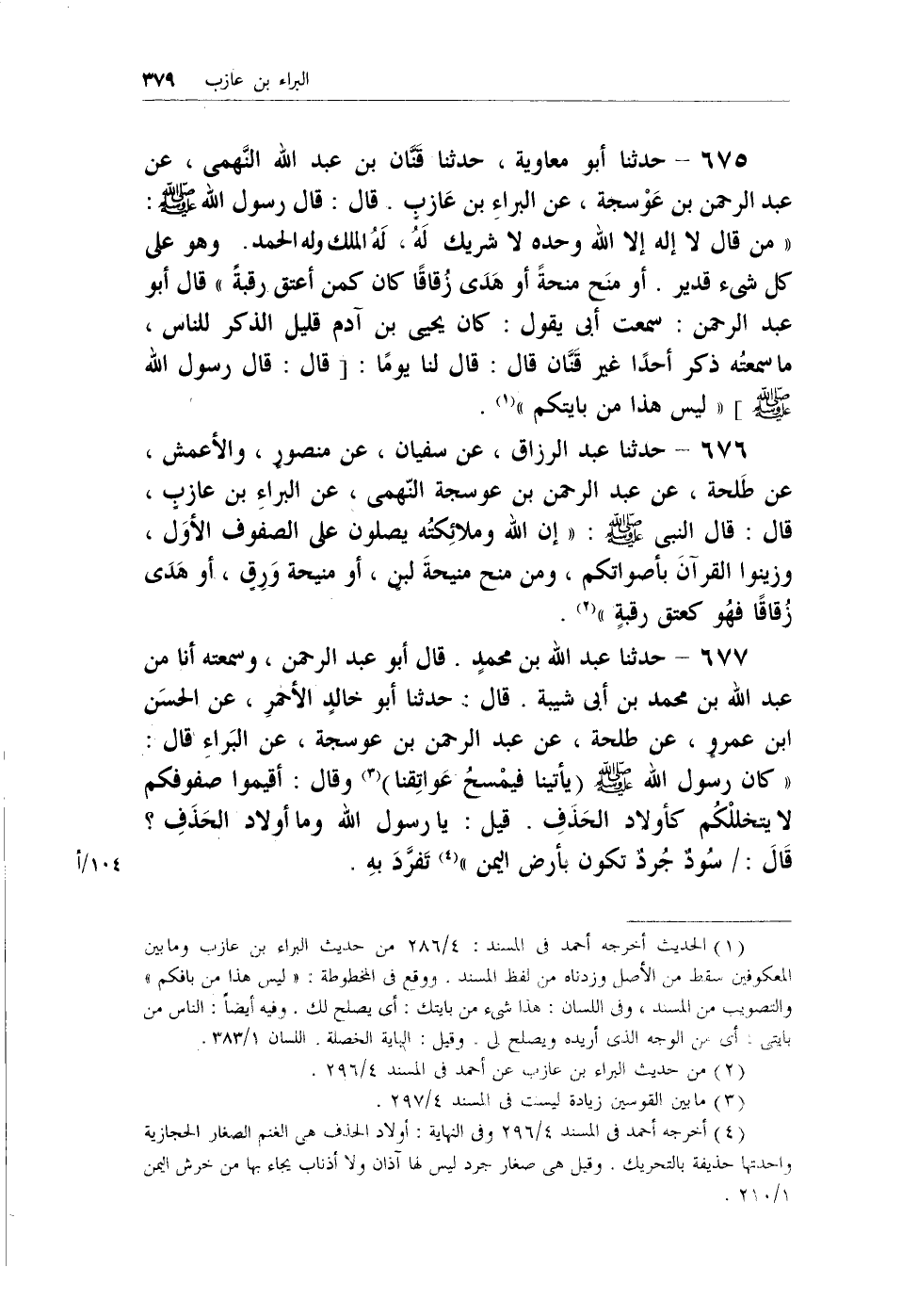 675 - حدثنا أبو معاوية، حدثنا قَنَّان بن عبد الله النَّهمي، عن عبد الرحمن ابن عوسجة، عن البراء بن عازبٍ. قال: قال رسول الله - صلى الله عليه وسلم -: (من قال لا إله إلا الله وحده لا شريك لهُ، لهُ الملك وله الحمد. وهو على كل شئ قدير. أو منح منحةً أو هدَى زُقاقاً كان كمن أعتق رقبةً) قال أبو عبد الرحمن: سمعت أبي يقول: كان يحيى بن آدم قليل الذكر للناس، ما سمعتُه ذكر أحداً غير قنَّان قال: قال لنا يوماً: [قال: قال رسول الله - صلى الله عليه وسلم -] (ليس هذا من بايتكم) (¬1) .