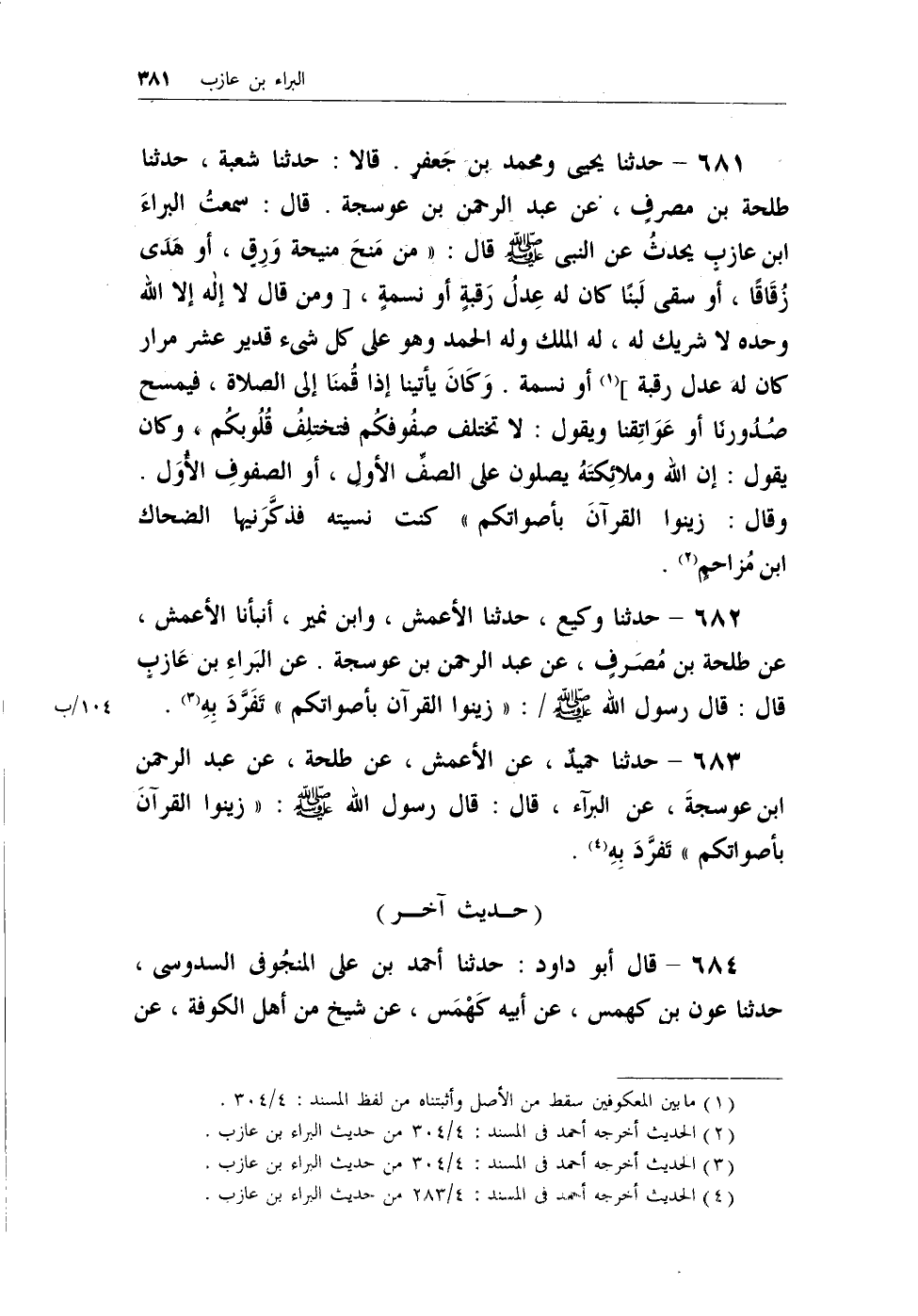 682 - حدثنا وكيع، حدثنا الأعمش، وابن نمير، أنبأنا الأعمش، عن طلحة بن مُصرفٍ، عن عبد الرحمن بن عوسجة. عن البراء بن عازبٍ قال: قال رسول الله - صلى الله عليه وسلم - /: (زينوا القرآن بأصواتكم) تفرد به (¬3) .
