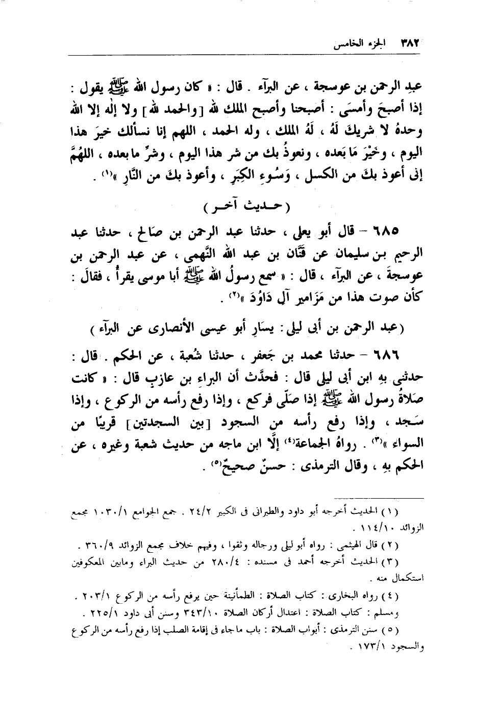 686 - حدثنا محمد بن جعفر، حدثنا شعبة، عن الحكم. قال: حدثني به ابن أبي ليلى قال: فحدَّث أن البراء بن عازبٍ قال: (كانت صلاةُ رسول الله - صلى الله عليه وسلم - إذا صلى فركع، وإذا رفع رأسه من الركوع، وإذا سجد، وإذا رفع رأسه من السجود [بين السجدتين] قريباً من السواء) (¬2) . رواهُ الجماعة (¬3)