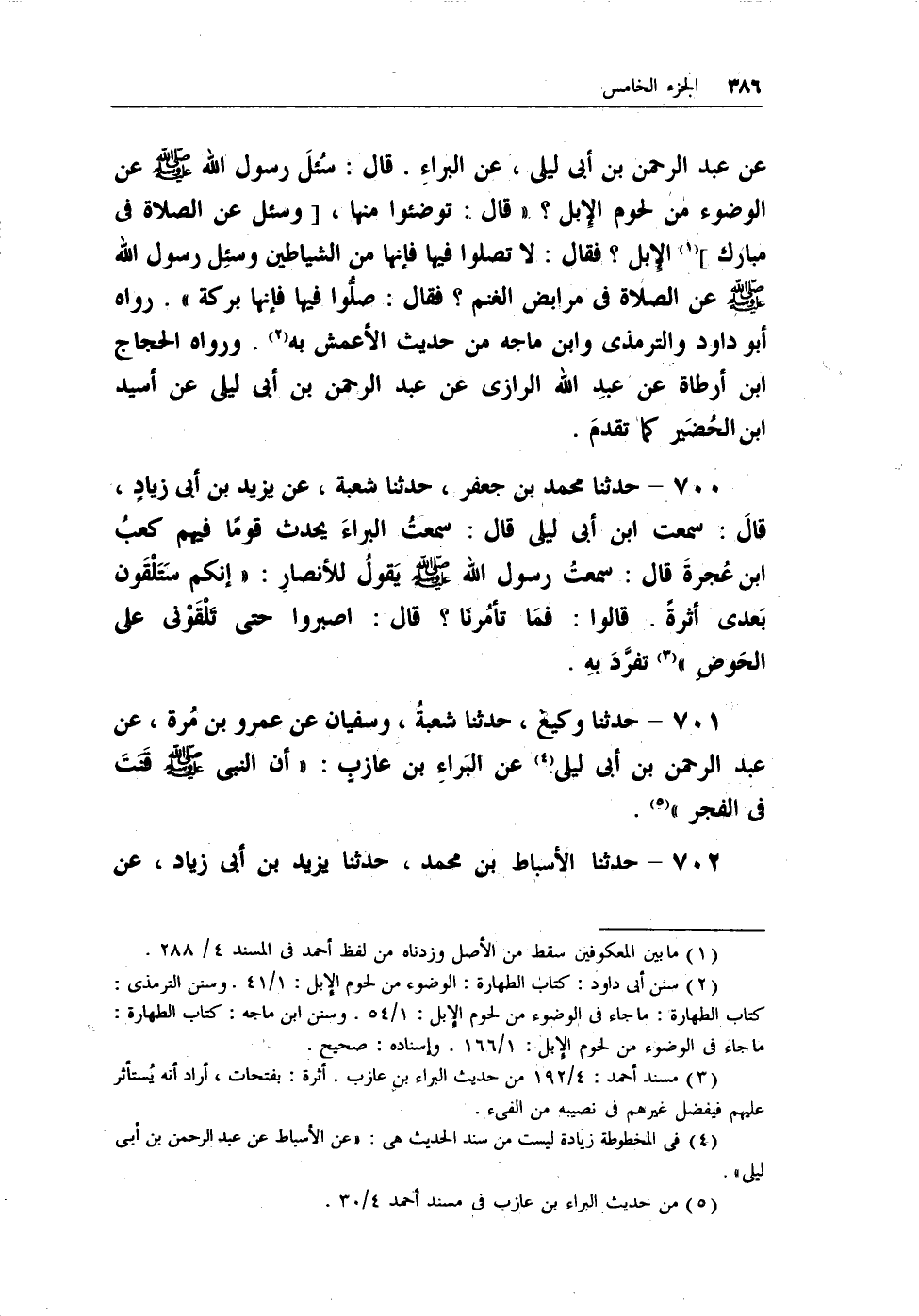 (¬2) سنن أبي داود: كتاب الطهارة: الوضوء من لحوم الإبل: 1/41. وسنن الترمذي: كتاب الطهارة: ماجاء في الوضوء من لحوم الإبل: 1/54. وسنن ابن ماجه: كتاب الطهارة: ماجاء في الوضوء من لحوم الإبل: 1/166. وإسناده: صحيح.