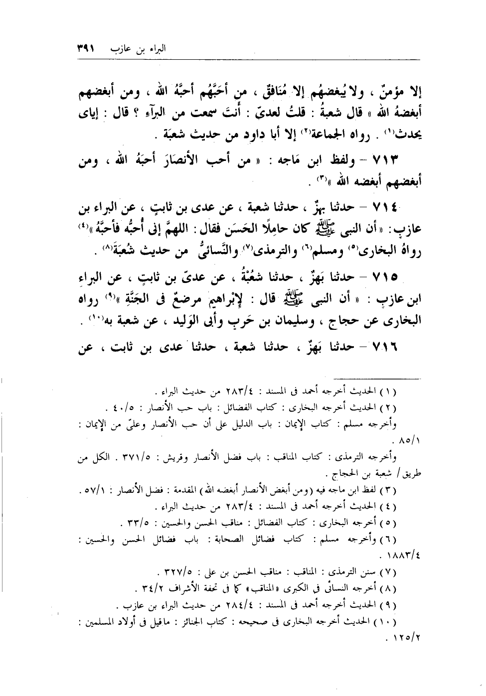 714 - حدثنا بهزٌ، حدثنا شعبة، عن عدي بن ثابتٍ، عن البراء بن عازبٍ: (أن النبي - صلى الله عليه وسلم - كان حاملاً الحسن فقال: اللهم إني أُحبُّه فأحبَّهُ) (¬2) رواهُ البخاري (¬3) ومسلم (¬4) والترمذي (¬5) والنسائيُّ من حديث شعبة (¬6) .