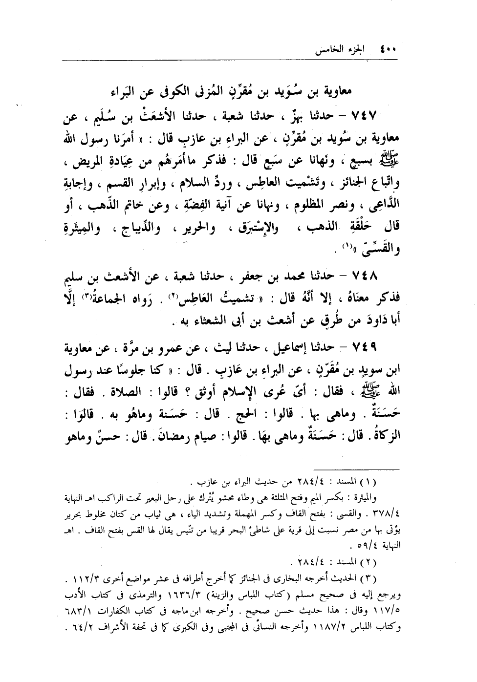 748 - حدثنا محمد بن جعفر، حدثنا شعبة، عن الأشعث بن سليم فذكر معناهُ، إلا أنُّهُ قال: (تشميتُ العاطِس (¬2) . رواه الجماعةُ (¬3)