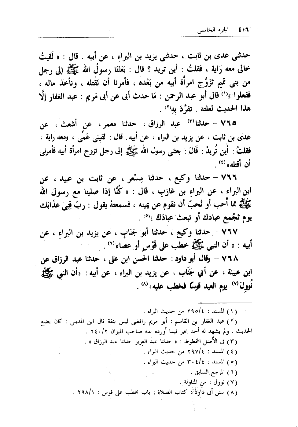 765 - حدثنا (¬1) عبد الرزاق، حدثنا معمر، عن أشعث، عن عدي بن ثابت، عن يزيد بن البراء، عن أبيه. قال: لقيني عمي، ومعه راية، فقلتُ: أين تُريدُ: قَالَ: بعثني رسول الله - صلى الله عليه وسلم - إلى رجل تزوج امرأة أبيه فأمرني أن أقتله) (¬2) .