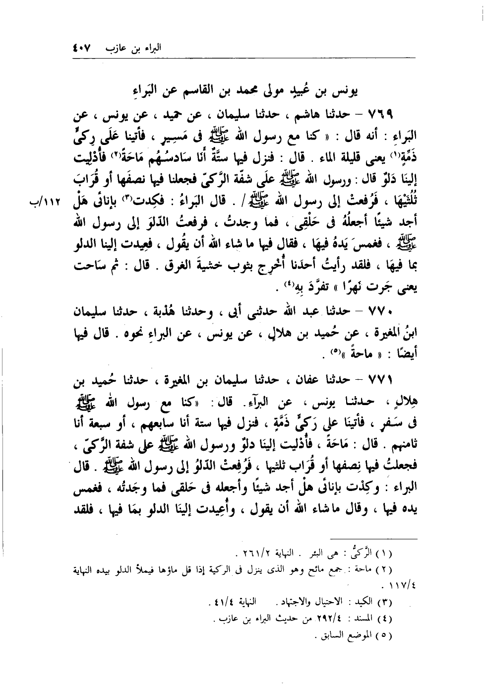771 - حدثنا عفان، حدثنا سليمان بن المغيرة، حدثنا حُميد بن هلالٍ، حدثنا يونس، عن البراء. قال: (كُنا مع رسول الله - صلى الله عليه وسلم - في سفرٍ، فأتينا على ركيٍّ ذمةٍ، فنزل فيها ستة أنا سابعهم، أو سبعة أنا ثامنهم. قال: ماحةً، فأُدليت إلينا دلوٌ ورسول الله - صلى الله عليه وسلم - على شفة الرَّكى، فجعلتُ فيها نصفها أو قُرَاب ثلثيها، فرُفِعتْ الدلو إلى رسول الله - صلى الله عليه وسلم -. قال البراء: وكدت بإنائي هل أجد شيئاً وأجعله في حَلقي فما وجدته، فغمس يده فيها، وقال ما شاء الله أن يقول، وأُعِيدت إلينا الدلو بما فيها، فلقد