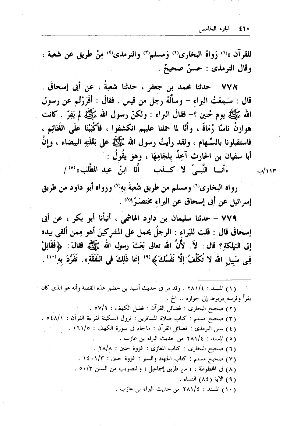 778 - حدثنا محمد بن جعفر، حدثنا شعبةُ، عن أبي إسحاقَ. قال: سمعْتُ البراء - وسألهُ رجل من قيس. فقال: أفَرَرْتُم عن رسول الله - صلى الله عليه وسلم - يوم حنين؟ - فقال البراء: ولكن رسول الله - صلى الله عليه وسلم - لم يَفِرّ. كانت هوازنُ ناساً رُماةً، وأنَّا لما حملنا عليهم انكشفوا، فأكبَبْنَا على الغنائِم، فاستقبلونا بالسِّهام، ولقد رأيتُ