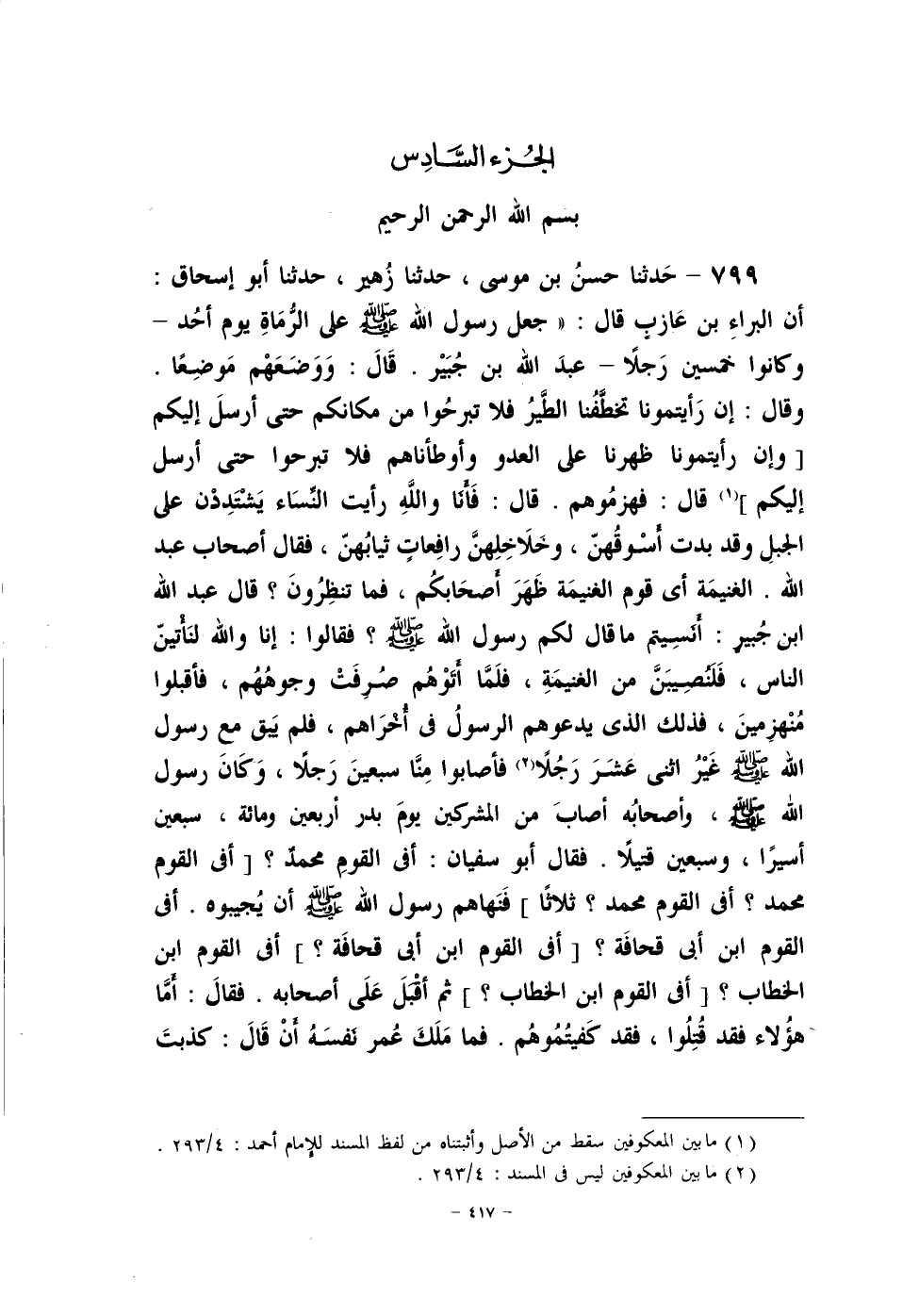 799 - حدثنا حسنُ بن موسى، حدثنا زُهير، حدثنا أبو إسحاق: أن البراء ابن عازبٍ قال: (جعل رسول الله - صلى الله عليه وسلم - على الرُّماةِ يوم أحد - وكانوا خمسين رجلاً- عبد الله بن جُبَيْر. قال: ووضعهم موضعاً وقال: إن رأيتمونا تخطَّفنا الطَّير فلا تبرحوا من مكانكم حتى أرسل إليكم [وإن رأيتمونا ظهرنا على العدو وأوطأناهم فلا تبرحوا حتى أرسل إليكم] (¬1) قال: فهزموهم. قال: فأَنَا والله رأيت النِّساء يشتتدن على الجبل وقد بدت أَسوقُهنّ، وخلاخِلهنَّ رافعات ثيابُهن، فقال أصحاب عبد الله. الغنيمة أي قوم الغنيمة ظهر أصحابكُم، فما تنظرُون؟ قال عبد الله بن جبير: أنسيتم ما قال لكم رسول الله - صلى الله عليه وسلم -؟ فقالوا: إنا والله لنأتين الناس، فلنًصِيبن من الغنيمة، فلما أتوهم صُرفت وجوهُهُم، فأقبلوا منهزمين، فذلك الذي يدعوهم الرسولُ في أُخْرَاهم، فلم يبق مع رسول الله - صلى الله عليه وسلم - غيرُ اثني عشر رجلاً (¬2) فأصابوا منا سبعين رجلاً، وكان رسول الله - صلى الله عليه وسلم -، وأصحابُه أصاب من المشركين يوم بدر أربعين ومائة، سبعين أسيراً، وسبعين قتيلاً. فقال أبو سفيان: أفي القوم محمدٌ؟ [أفي القوم محمد؟ أفي القوم محمد؟ ثلاثاً] فنهاهم رسول الله - صلى الله عليه وسلم - أن يُجيبوه. أفي القوم ابن أبي قحافة؟ [أفي القوم ابن أبي قحافة؟] أفي القوم ابن الخطاب؟ [أفي القوم ابن الخطاب؟] ثم أقبل على أصحابه. فقال: أَمَّا هؤلاء فقد قُتلوا، فقد كفيتموهم. فما ملك عُمر نفسه أن قال: كذبتَ