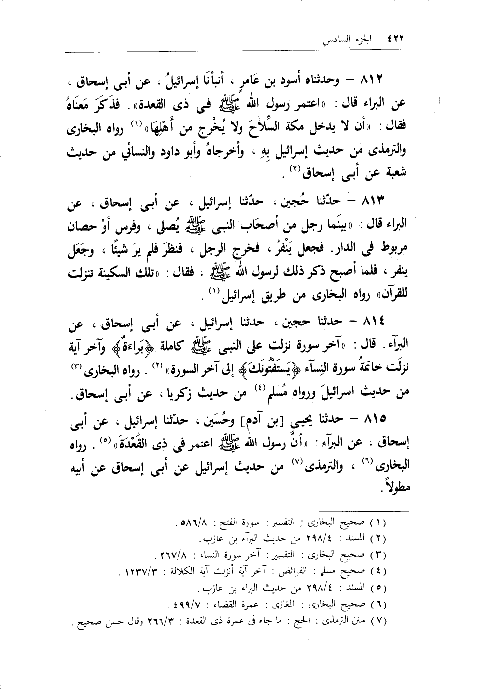 815 - حدثنا يحيى [بن آدم] وحُسين، حدثنا إسرائيل، عن أبي إسحاق، عن البرآءِ: (أنَّ رسول الله - صلى الله عليه وسلم - اعتمر في ذي القعدة) (¬7) . رواه البخاري (¬8) ، والترمذي (¬9) من حديث إسرائيل عن أبي إسحاق عن أبيه مطولاً.