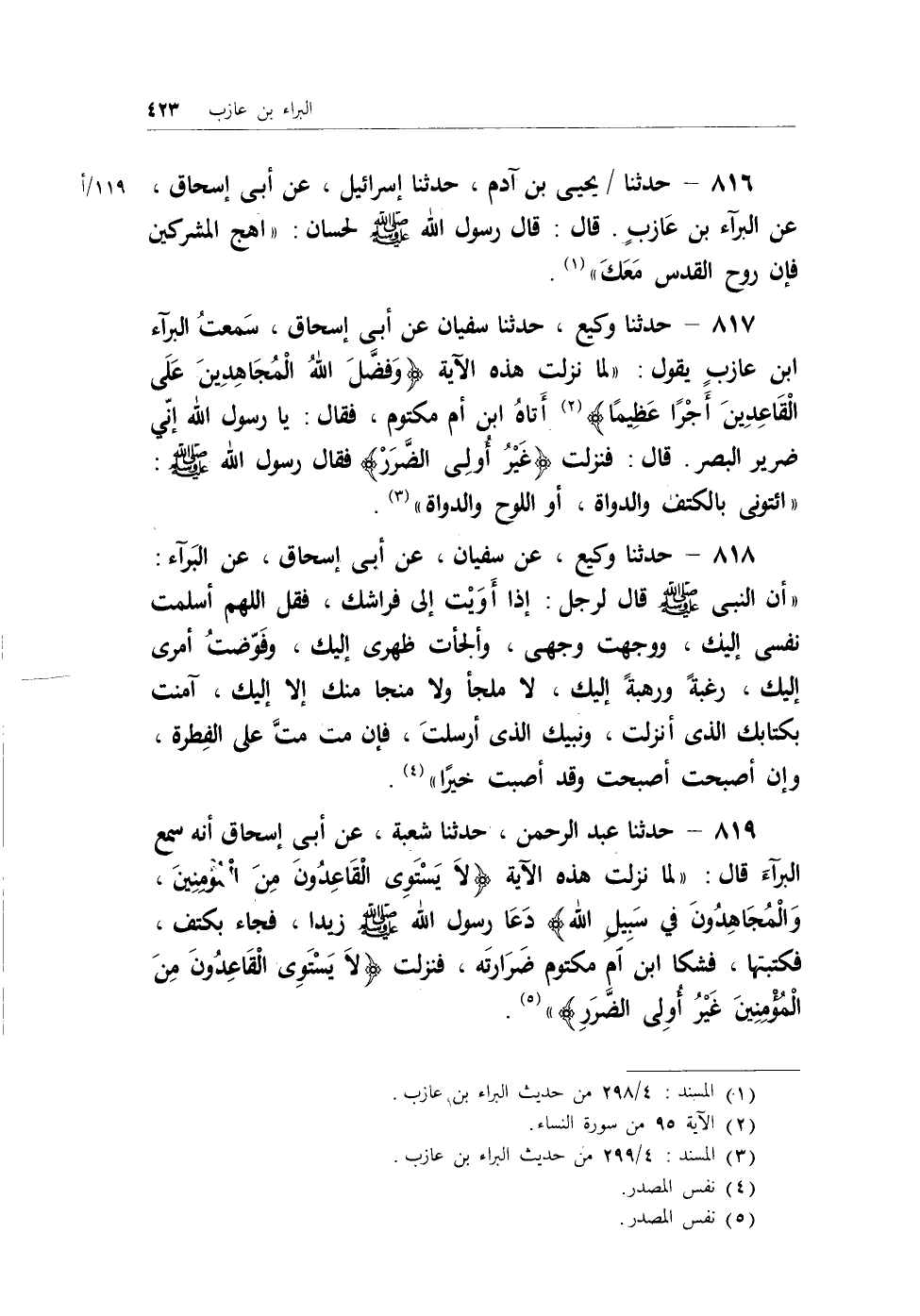 819 - حدثنا عبد الرحمن، حدثنا شعبة، عن أبي إسحاق أنه سمع البرآء قال: (لما نزلت هذه الآية {لا يَسْتَوِي الْقَاعِدُونَ مِنْ الْمُؤْمِنِينَ غَيْرُ أُوْلِي الضَّرَرِ وَالْمُجَاهِدُونَ فِي سَبِيلِ اللَّهِ} دعا رسول الله - صلى الله عليه وسلم - زيداً، فجاء بكتف، فكتبتها، فشكا ابن أم مكتوم ضرارته، فنزلت {لا يَسْتَوِي الْقَاعِدُونَ مِنْ الْمُؤْمِنِينَ غَيْرُ أُوْلِي الضَّرَرِ} ) (¬5) .