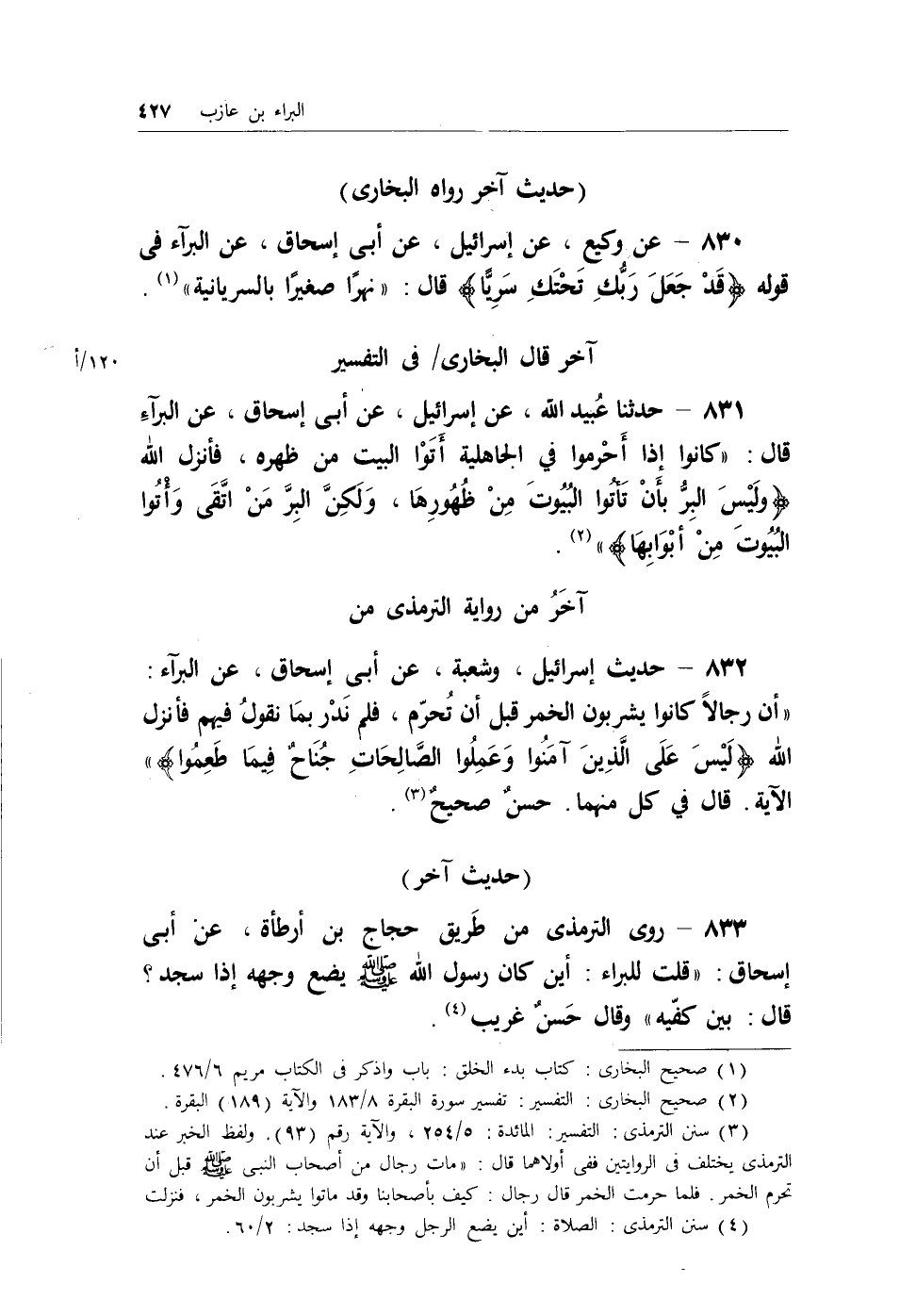 832 - حديث إسرائيل، وشعبة، عن أبي إسحاق، عن البرآء: (أن رجالاً كانوا يشربون الخمر قبل أن تُحرم، فلم ندر بما نقول فيهم فأنزل الله {لَيْسَ عَلَى الَّذِينَ آمَنُوا وَعَمِلُوا الصَّالِحَاتِ جُنَاحٌ فِيمَا طَعِمُوا} ) الآية. قال في كل منهما. حسنٌ صحيحٌ (¬3) .