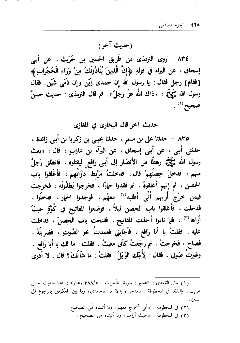 834 - روى الترمذي من طريق الحسين بن حُريث، عن أبي إسحاق، عن البراء في قوله {إن الذين ينادونك من وراء الحُجُرات} [فقام] رجل فقال: يارسول الله إن حمدي زين وإن ذمي شين. فقال رسول الله - صلى الله عليه وسلم -: (ذاك الله عزّ وجلّ) . ثم قال الترمذي: حديث حسنٌ صحيح (¬1) .