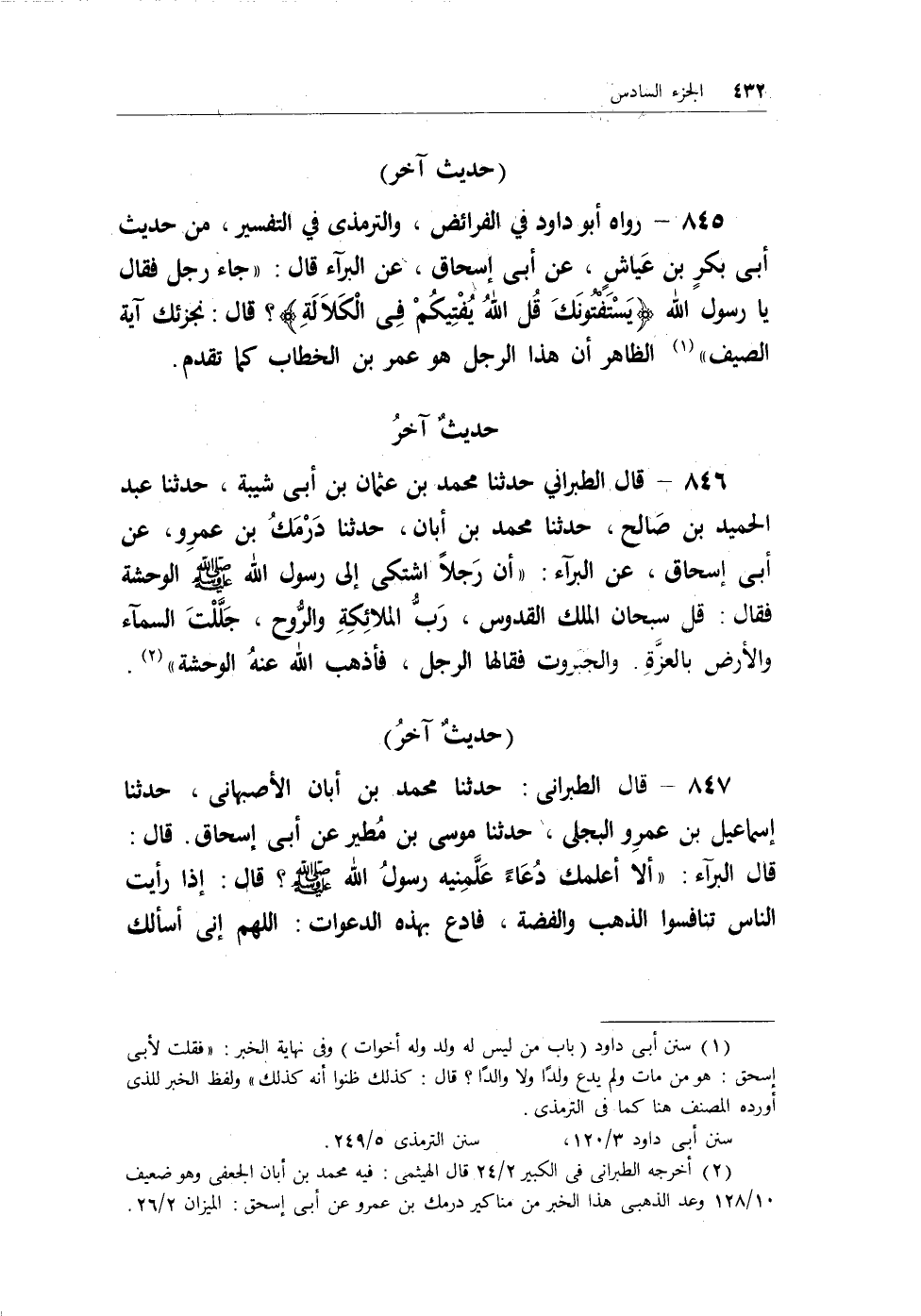 845 - رواه أبو داود في الفرائض، والترمذي في التفسير، من حديث أبي بكرٍ بن عياشٍ، عن أبي إسحاق، عن البرآء قال: (جاء رجل فقال يارسول الله {يَسْتَفْتُونَكَ قُلِ اللهُ يُفْتِيكُم في الكَلالَةِ} ؟ قال: نجزئك آية الصيف) (¬1) الظاهر أن هذا الرجل هو عمر بن الخطاب كما تقدم.