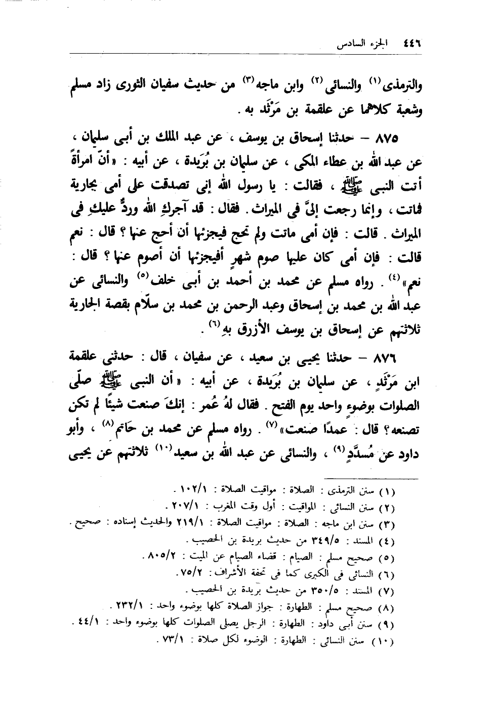 876 - حدثنا يحيى بن سعيد، عن سفيان، قال: حدثني علقمة بن مرثدٍ، عن سليمان بن بُريدة، عن أبيه: (أن النبي - صلى الله عليه وسلم - صلى الصلوات بوضوءٍ واحد يوم الفتح. فقال لهُ عمر: إنك صنعت شيئاً لم تكن تصنعه؟ قال: عمداً صنعت) (¬4) . رواه مسلم عن محمد بن حاتم (¬5) ، وأبو داود عن مُسدَّدٍ (¬6) ، والنسائي عن عبد الله بن سعيد (¬7) ثلاثتهم عن يحيى