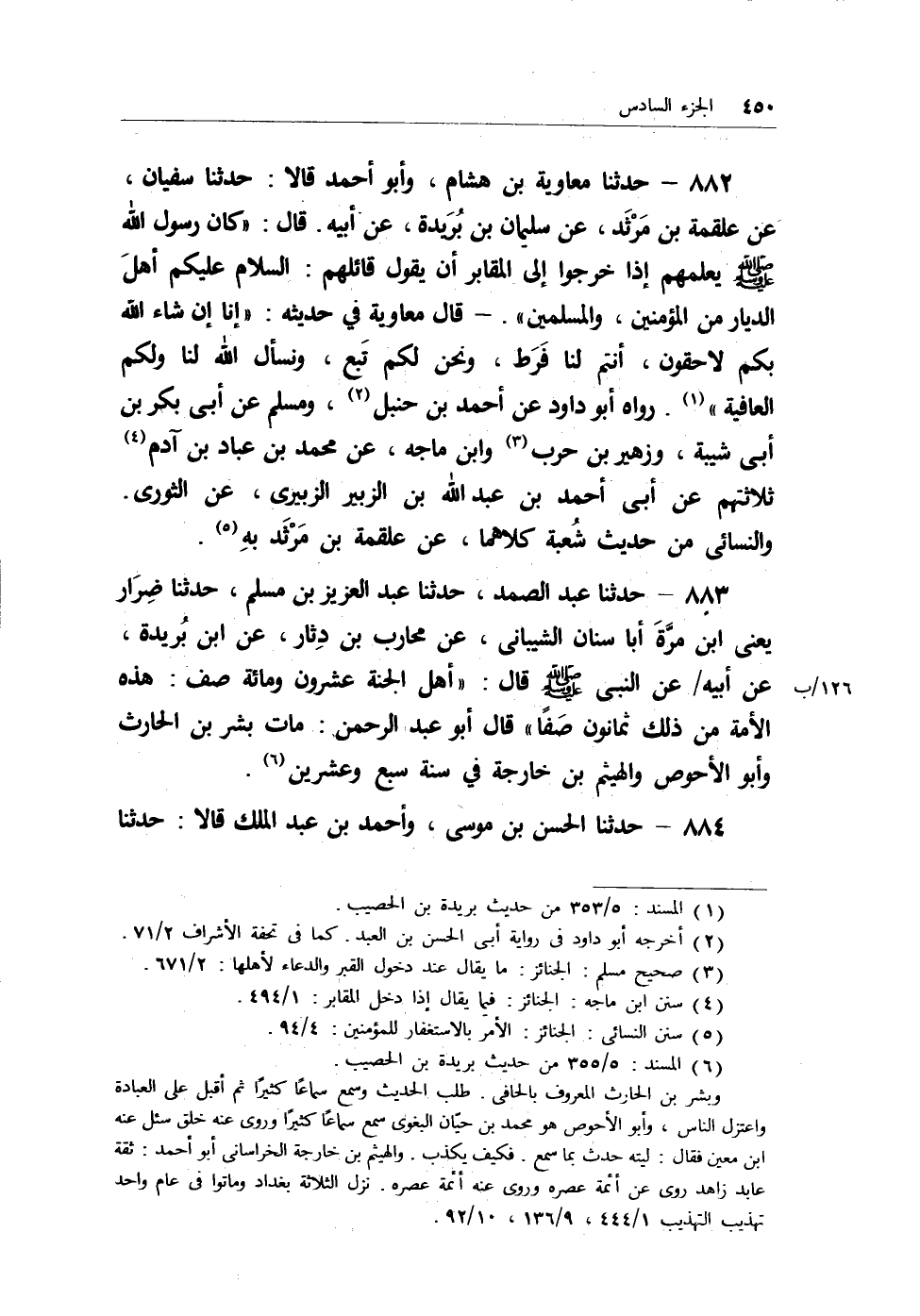 882 - حدثنا معاوية بن هشام، وأبو أحمد قالا: حدثنا سفيان، عن علقمة ابن مرثد، عن سليمان بن بُريدة، عن أبيه. قال: (كان رسول الله - صلى الله عليه وسلم - يعلمهم إذا خرجوا إلى المقابر أن يقول قائلهم: السلام عليكم أهل الديار من المؤمنين، والمسلمين) . - قال معاوية في حديثه: (إنا إن شاء الله بكم لاحقون، أنتم لنا فَرَط، ونحن لكم تَبع، ونسأل الله لنا ولكم العافية) (¬1) . رواه أبو داود عن أحمد بن حنبل (¬2) ، ومسلم عن أبي بكر بن أبي شيبة، وزهير بن حرب (¬3) وابن ماجه، عن محمد بن عباد بن آدم (¬4) ثلاثتهم عن أبي أحمد بن عبد الله بن الزبير الزبيري، عن الثوري. والنسائي من حديث شُعبة كلاهما، عن علقمة بن مرثد بهِ (¬5) .