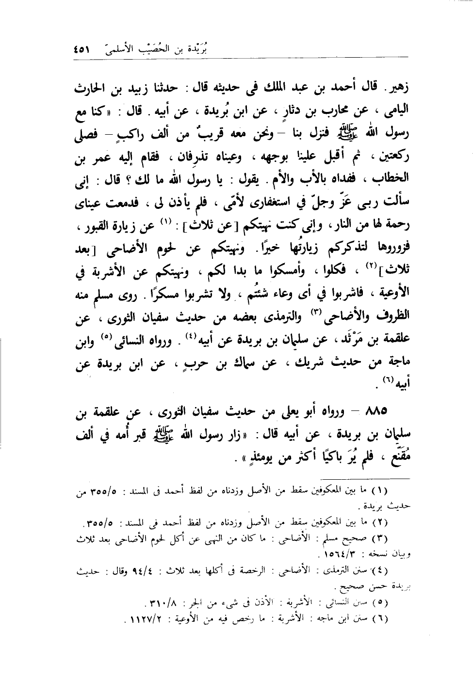 زهير. قال أحمد بن عبد الملك في حديثه قال: حدثنا زبيد بن الحارث اليامي، عن محارب بن دثارٍ، عن ابن بُريدة، عن أبيه. قال: (كنا مع رسول الله - صلى الله عليه وسلم - فنزل بنا - ونحن معه قريبٌ من ألف راكبٍ - فصلى ركعتين، ثم أقبل علينا بوجهه، وعيناه تذرفان، فقام إليه عمر بن الخطاب، ففداه بالأب والأم. يقول: يارسول الله ما لك؟ قال: إني سألت ربي عز وجل في استغفاري لأمي، فلم يأذن لي، فدمعت عيناي رحمة لها من النار، وإني كنت نهيتكم [عن ثلاث] : (¬1) عن زيارة القبور، فزوروها لتذكركم زيارتُها خيراً. ونهيتكم عن لحوم الأضاحي [بعد ثلاث] (¬2) ، فكلوا، وأمسكوا ما بدا لكم، ونهيتكم عن الأشربة في الأوعية، فاشربوا في أي وعاء شئتُم، ولا تشربوا مسكراً. روى مسلم منه الظروف والأضاحي (¬3) والترمذي بعضه من حديث سفيان الثوري، عن علقمة بن مَرْثَد، عن سليمان بن بريدة عن أبيه (¬4) . ورواه النسائي (¬5) وابن ماجه من حديث شريك، عن سماك بن حربٍ، عن ابن بريدة عن أبيه (¬6) .