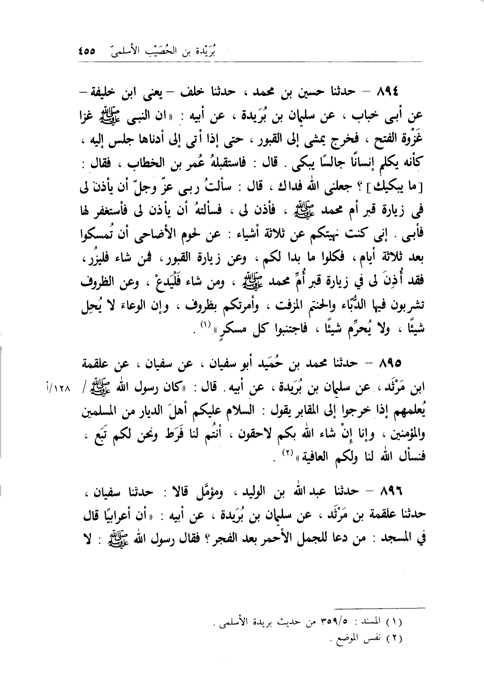 894 - حدثنا حسين بن محمد، حدثنا خلف - يعني ابن خليفة - عن أبي خباب، عن سليمان بن بُريدة، عن أبيه: (أن النبي - صلى الله عليه وسلم - غزا غزوة الفتح، فخرج يمشي إلى القبور، حتى إذا أتى إلى أدناها جلس إليه، كأنه يكلم إنساناً جالساً يبكي. قال: فاستقبلهُ عُمر بن الخطاب، فقال: [ما يبكيك] ؟ جعلني الله فداك، قال: سألتُ ربي عز وجل أن يأذن لي في زيارة قبر أم محمد - صلى الله عليه وسلم -، فأذن لي، فسألتهُ أن يأذن لي فأستغفر لها فأبى. إني كنت نهيتكم عن ثلاثة أشياء: عن لحوم الأضاحي أن تُمسكوا بعد ثلاثة أيام، فكلوا ما بدا لكم، وعن زيارة القبور، فمن شاء فليزُر، فقد أُذِنَ لي في زيارة قبر أُمِّ محمد - صلى الله عليه وسلم -، ومن شاء فليدعْ، وعن الظروف تشربون فيها الدُّباء والحنتم المزفت، وأمرتكم بظروف، وإن الوعاءَ لا يُحل شيئاً، ولا يُحرِّم شيئاً، فاجتنبوا كل مسكرٍ) (¬1) .