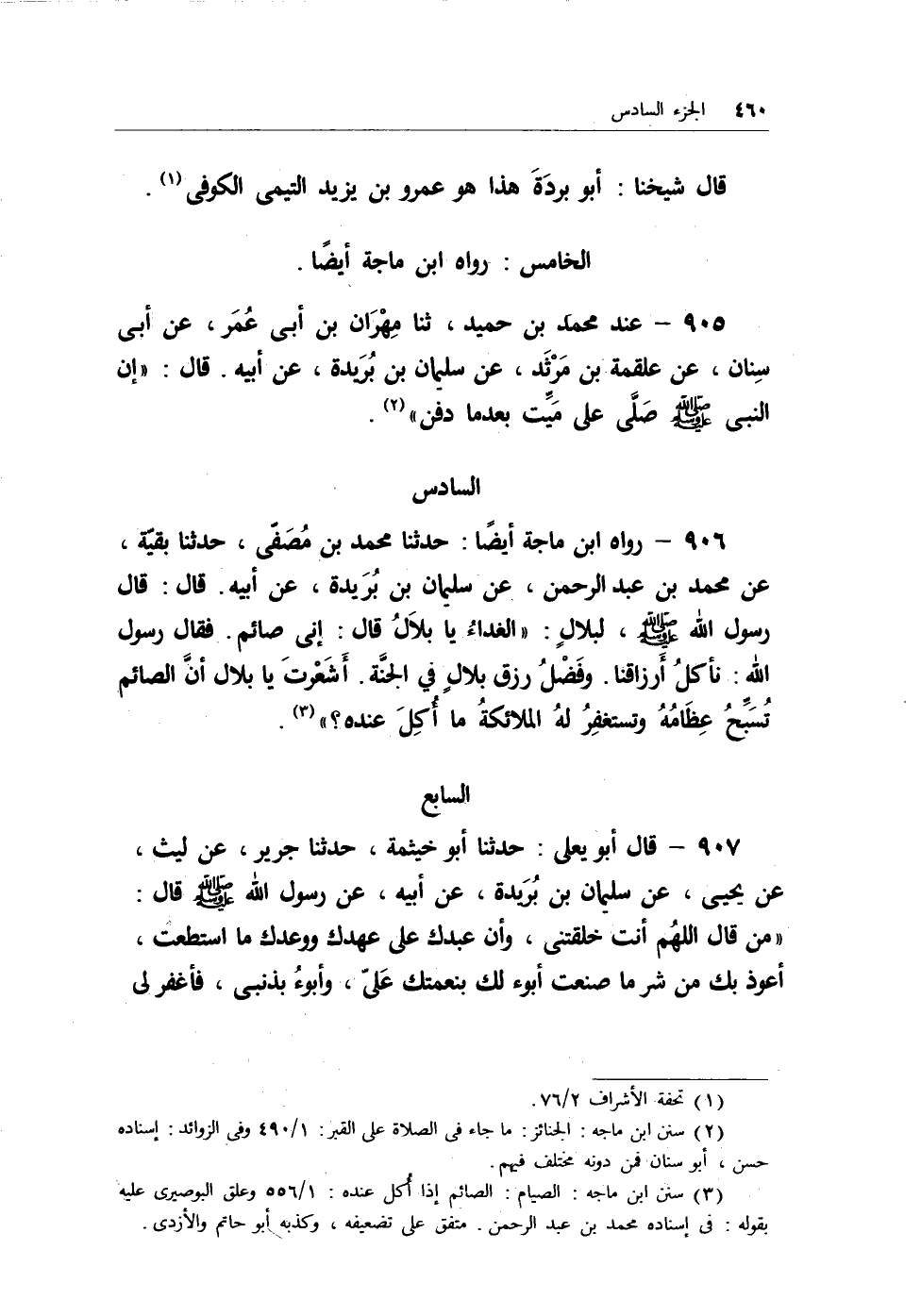 906 - رواه ابن ماجة أيضاً: حدثنا محمد بن مُصفّى، حدثنا بقية، عن محمد بن عبد الرحمن، عن سليمان بن بُريدة، عن أبيه. قال: قال رسول الله - صلى الله عليه وسلم -، لبلالٍ: (الغداءُ يابلالُ قال: إني صائم. فقال رسول الله: نأكلُ أرزاقنا. وفَضْلُ رزق بلالٍ في الجنَّة. أشَعْرتَ يا بلال أنَّ الصائم تُسبِّحُ عظَامُهُ وتستغفِرُ لهُ الملائكةُ ما أُكلَ عنده؟) (¬2) .