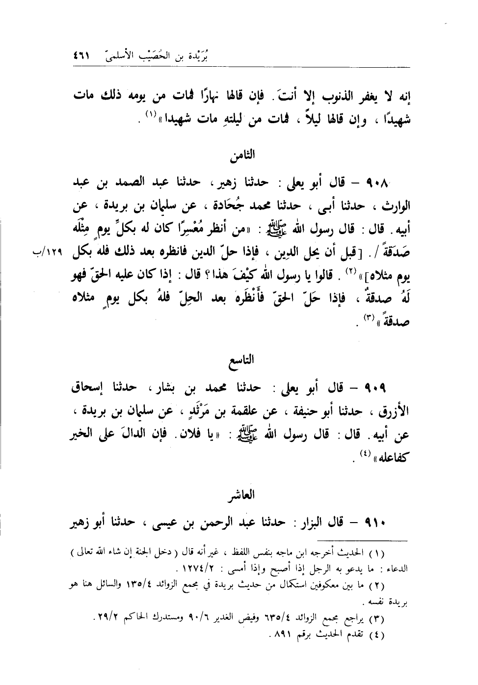 908 - قال أبو يعلى: حدثنا زهير، حدثنا عبد الصمد بن عبد الوارث، حدثنا أبي، حدثنا محمد جُحَادة، عن سليمان بن بريدة، عن أبيه. قال: قال رسول الله - صلى الله عليه وسلم -: (من انظر مُعْسِراً كان له بكلِّ يومٍ مثله صدقة/. [قبل أن يحل الدين، فإذا حلّ الدين فانظره بعد ذلك فله بكل يوم مثلاه] ) (¬1) . قالوا يارسول الله كيف هذا؟ قال: إذا كان عليه الحقّ فهو لهُ صدقةٌ، فإذا حلّ الحق فانظره بعد الحِلّ فلهُ بكل يومٍ مثلاه صدقةً) (¬2) .
