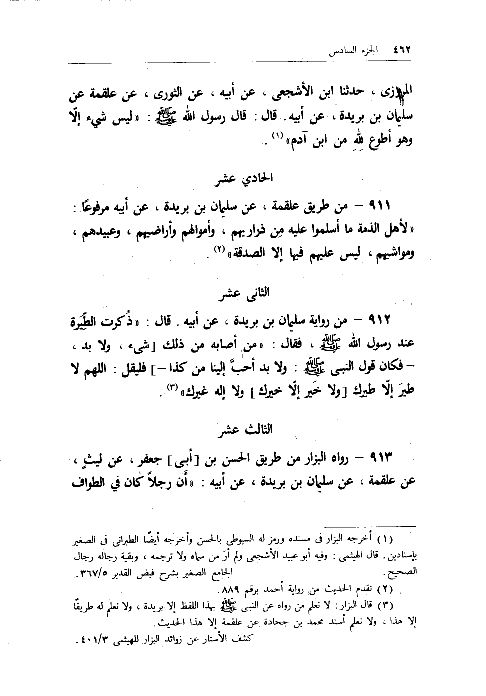 (¬2) قال البزار: لا نعلم من رواه عن النبي - صلى الله عليه وسلم - بهذا اللفظ إلا بريدة، ولا نعلم له طريقاً إلا هذا، ولا نعلم أسند محمد بن جحادة عن علقمة إلا هذا الحديث. كشف الأستار عن زوائد البزار للهيثمي 3/401.