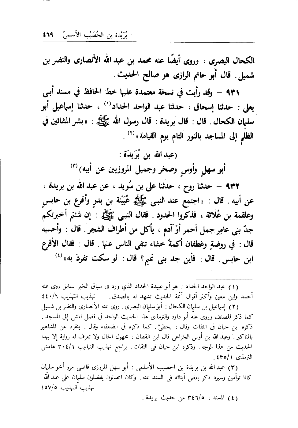 931 - وقد رأيت في نسخة معتمدة عليها خط الحافظ في مسند أبي يعلى: حدثنا إسحاق، حدثنا عبد الواحد الحداد (¬1) ، حدثنا إسماعيل أبو سليمان الكحال. قال: قال بريدة: قال رسول الله - صلى الله عليه وسلم -: (بشر المشائين في الظلم إلى المساجد بالنور التام يوم القيامة) (¬2) .