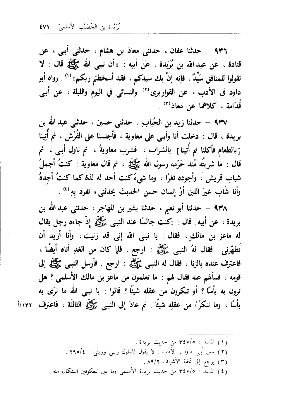 936 - حدثنا عفان، حدثني معاذ بن هشام، حدثني أبي، عن قتادة، عن عبد الله بن بُريدة، عن أبيه: (أن النبي - صلى الله عليه وسلم - قال: لا تقولوا للمنافق سَيِّدٌ، فإنه إن يك سيدكم، فقد أسخطتم ربكم) (¬1) . رواه أبو داود في الأدب، عن القواريري (¬2) والنسائي في اليوم والليلة، عن أبي قُدامة، كلاهما عن معاذ (¬3) .