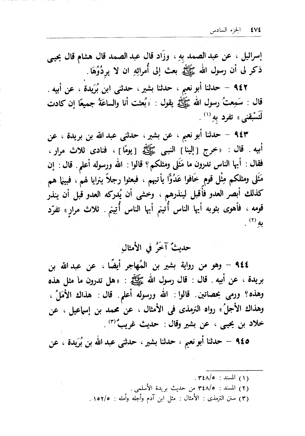 942 - حدثنا أبو نعيم، حدثنا بشير، حدثني ابن بُريدة، عن أبيه. قال: سمعتُ رسول الله - صلى الله عليه وسلم - يقول: (بُعثت أنا والساعةُ جميعاً إن كادت لتسبقني) تفرد بهِ (¬1) .