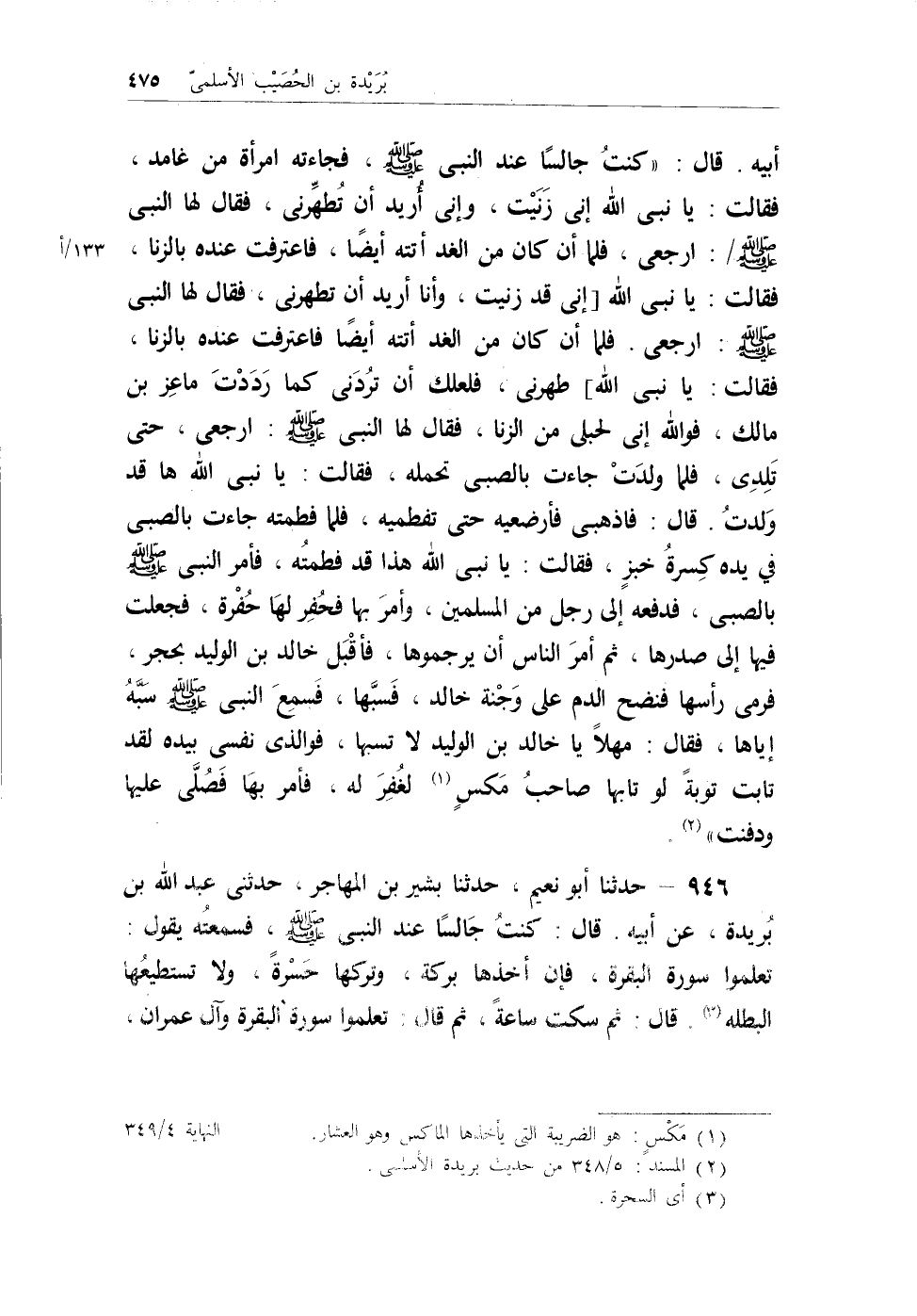 أبيه. قال: (كنتُ جالساً عند النبي - صلى الله عليه وسلم -، فجاءته امرأة من غامد، فقالت: يانبي الله إني زنيت، وإني أُريد أن تُطهِّرني، فقال لها النبي - صلى الله عليه وسلم - /: ارجعي، فلما أن كان من الغد أتته أيضاً، فاعترفت عنده بالزنا، فقالت: يانبي الله [إني قد زنيت، وأنا أريد أن تطهرني، فقال لها النبي - صلى الله عليه وسلم -: ارجعي. فلما أن كان من الغد أتته أيضاً فاعترفت عنده بالزنا، فقالت: يانبي الله] طهرني، فلعلك أن ترُدني كما رددت ماعِز بن مالك، فوالله إني لحبلى من الزنا، فقال لها النبي - صلى الله عليه وسلم -: ارجعي، حتى تَلِدِي، فلما ولدَتْ جاءت بالصبي تحمله، فقالت: يانبي الله ها قد وَلدتُ. قال: فاذهبي فأرضعيه حتى تفطميه، فلما فطمته جاءت بالصبي في يده كِسرةُ خبزٍ، فقالت: يا نبي الله هذا قد فطمتهُ، فأمر النبي - صلى الله عليه وسلم - بالصبي، فدفعه إلى رجل من المسلمين، وأمر بها فحُفِر لها حُفرة، فجعلت فيها إلى صدرها، ثم أمر الناس أن يرجموها، فأقبل خالد بن الوليد بحجر، فرمى رأسها فنضح الدم على وجنة خالد، فسبَّها، فسمع النبي - صلى الله عليه وسلم - سبَهُ إياها، فقال: مهلا ياخالد بن الوليد لا تسبها، فوالذي نفسي بيده لقد تابت توبةً لو تابها صاحبُ مكسٍ (¬1) لغُفِرَ له، فأمر بها فصُلَّى عليها ودفنت) (¬2) .