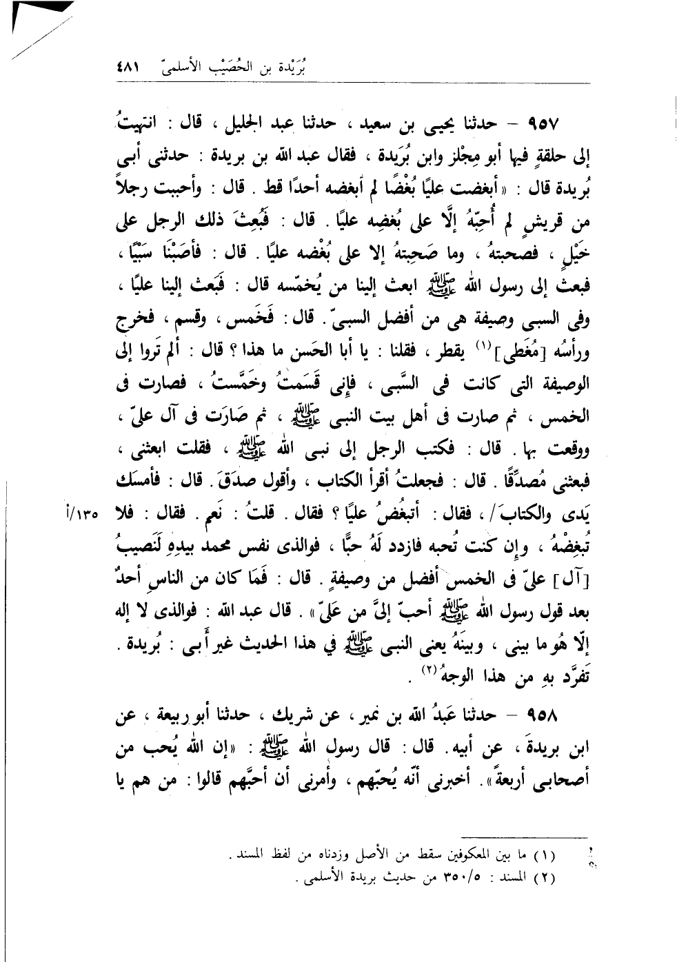 957 - حدثنا يحيى بن سعيد، حدثنا عبد الجليل، قال: انتهيت إلى حلقةٍ فيها أبو مجلز وابن بُريدة، فقال عبد الله بن بريدة: حدثني أبي بُريدة قال: (أبغضت علياً بُغضاً لم أبغضه أحداً قط. قال: وأحببت رجلاً من قريشٍ لم أُحِبّهُ إلاَّ على بُغضِه علياً. قال: فبُعِثَ ذلك الرجل على خيلٍ، فصحبتهُ، وما صحبتهُ إلا على بُغضه عليا. قال: فأصبنا سبياً، فبعث إلى رسول الله - صلى الله عليه وسلم - ابعث إلينا يُخمسه قال: فبعث إلينا علياً، وفي السبي وصيفة هي من أفضل السبى. قال: فخَمس، وقسم، فخرج ورأسُه [مُغَطى] (¬1) يقطر، فقلنا: يا أبا الحسن ما هذا؟ قال: ألم تروا إلى الوصيفة التي كانت في السبي، فإني قسمتُ وخمستُ، فصارت في الخمس، ثم صارت في أهل بيت النبي - صلى الله عليه وسلم -، ثم صارت في آل علي، ووقعت بها. قال: فكتب الرجل إلى نبي الله - صلى الله عليه وسلم -، فقلت ابعثني، فبعثني مُصدِّقاً. قال: فجعلتُ أقرأ الكتاب، وأقول صدق. قال: فأمسَك يَدي والكتابَ/، فقال: أتبغُضُ علياً؟ فقال. قلتُ: نعم. فقال: فلا تبغضهُ، وإن كنت تُحبه فازدد لهُ حباً، فوالذي نفس محمد بيده لنصيبُ [آل] عليّ في الخمس أفضل من وصيفةٍ. قال: فما كان من الناس أحدٌ بعد قول رسول الله - صلى الله عليه وسلم - أحبّ إليَّ من علي) . قال عبد الله: فوالذي لا إله إلاَّ هو مابيني، وبينهُ يعني النبي - صلى الله عليه وسلم - في هذا الحديث غير أَبي: بُريدة. تفرَّد بهِ من هذا الوجهُ (¬2) .