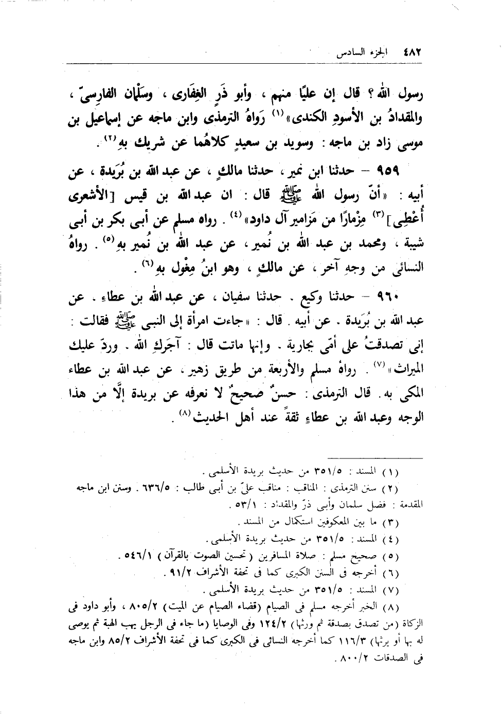 أمي بجارية، وإنها ماتت قال: آجركِ الله. ورد عليك الميراث) (¬5) . رواهُ مسلم والأربعة من طريق زهير، عن عبد الله بن عطاء المكي به. قال الترمذي: حسنٌ صحيحٌ لا نعرفه عن بريدة إلاَّ من هذا الوجه وعبد الله بن عطاءٍ ثقةً عند أهل الحديث (¬6) .