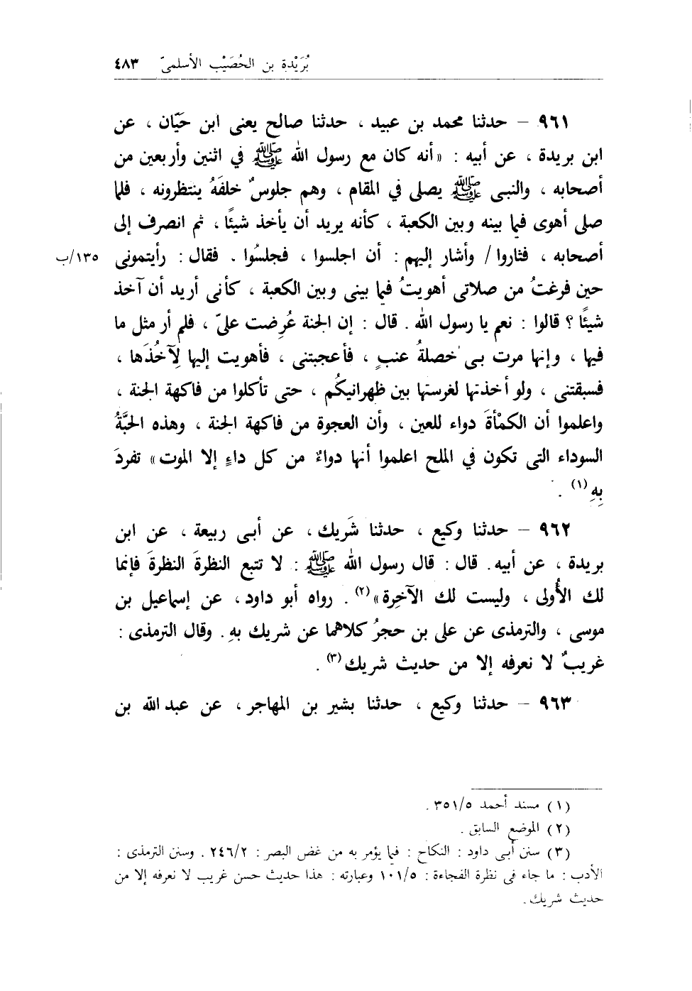 962 - حدثنا وكيع، حدثنا شريك، عن أبي ربيعة، عن ابن بريدة، عن أبيه. قال: قال رسول الله - صلى الله عليه وسلم -: لا تتبع النظرةَ النظرةَ فإنما لك الأُولى، وليست لك الآخِرة) (¬2) . رواه أبو داود، عن إسماعيل بن موسى، والترمذي عن علي بن حجرُ كلاهما عن شريك بهِ. وقال الترمذي: غريبٌ لا نعرفه إلا من حديث شريك (¬3) .