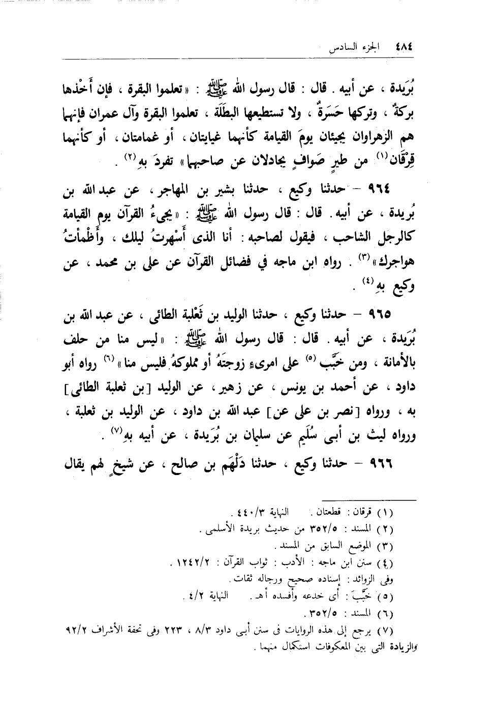 964 - حدثنا وكيع، حدثنا بشير بن المهاجر، عن عبد الله بن بُريدة، عن أبيه. قال: قال رسول الله - صلى الله عليه وسلم -: (يجئُ القرآن يوم القيامة كالرجل الشاحب، فيقول لصاحبه: أنا الذي أَسْهرتُ ليلتك، وأَظمأتُ هواجرك) (¬1) . رواه ابن ماجه في فضائل القرآن عن علي بن محمد، عن وكيع بهِ (¬2) .