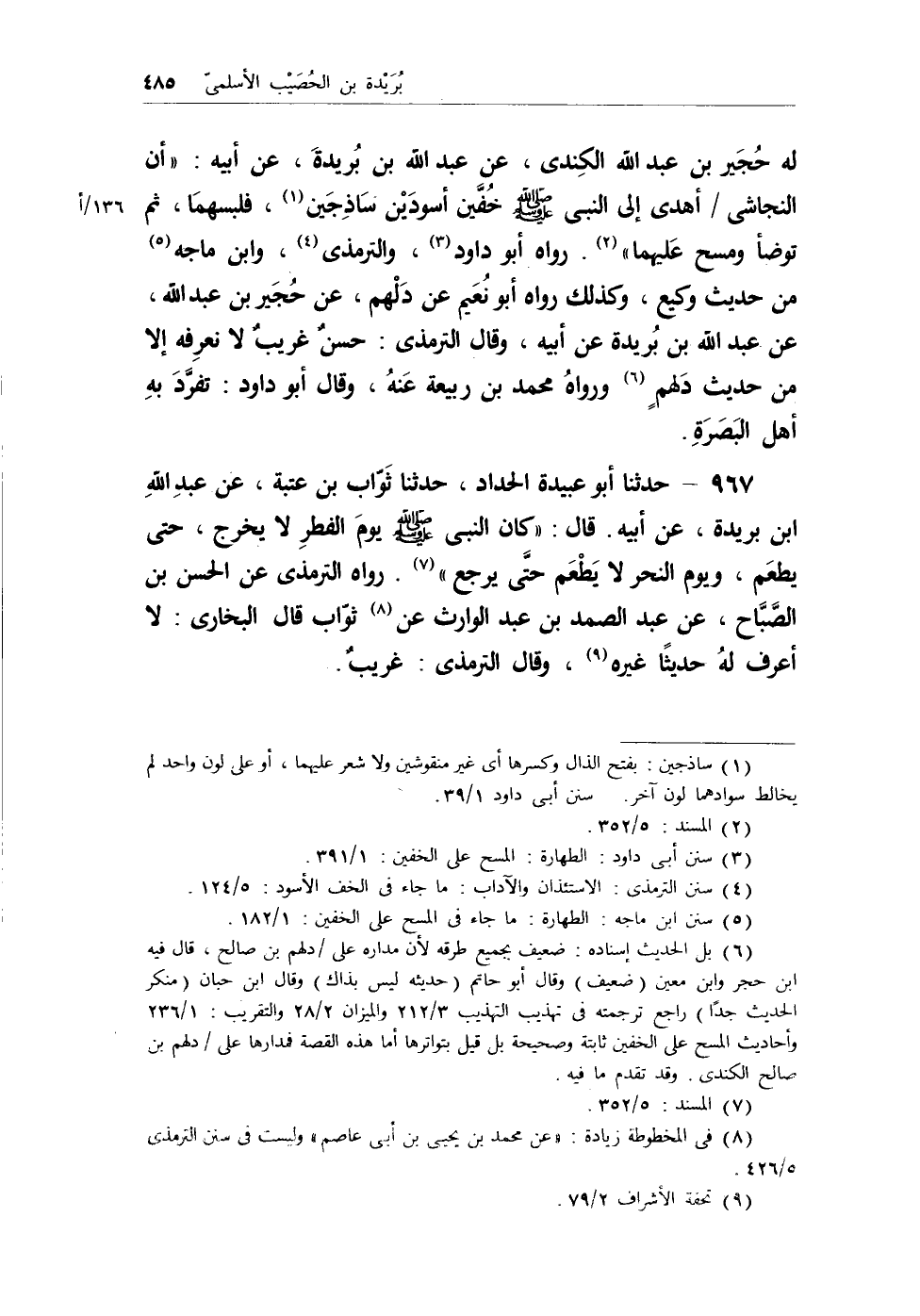 له حُجَير ابن عبد الله الكندي، عن عبد الله بن بُريدة، عن أبيه: (أن النجاشي/ أهدى إلى النبي - صلى الله عليه وسلم - خُفَّين أسودين ساذجين (¬1) ، فلبسهما، ثم توضأ ومسح عليهما) (¬2) . رواه أبو داود (¬3) ، والترمذي (¬4) ، وابن ماجه (¬5) من حديث وكيع، وكذلك رواه أبو نُعيم عن دلهم، عن حُجَير بن عبد الله، عن عبد الله بن بُريدة عن أبيه، وقال الترمذي: حسنٌ غريبٌ لا نعرفه إلا من حديث دلهمٍ (¬6)
