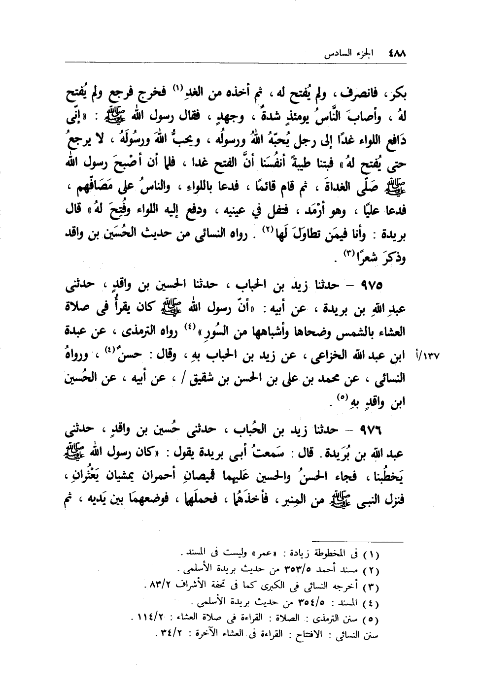 975 - حدثنا زيد بن الحباب، حدثنا الحسين بن واقدٍ، حدثني عبد الله بن بريدة، عن أبيه: (أن رسول الله - صلى الله عليه وسلم - كان يقرأُ في صلاة العشاء بالشمس وضحاها وأشباهها من السُور) (¬1) رواه الترمذي، عن عبدة بن عبد الله الخزاعي، عن زيد بن الحباب بهِ، وقال: حسنٌ (¬2) ، ورواهُ النسائي، عن محمد بن علي بن الحسن بن شقيق/، عن أبيه، عن الحُسين بن واقدٍ بهِ (¬3) .