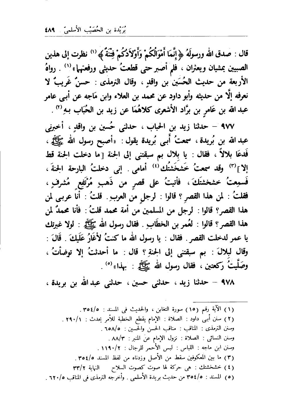 977 - حدثنا زيد بن الحباب، حدثني حُسين بن واقدٍ، أخبرني عبد الله ابن بُريدة، سمعتُ أبي بُريدة يقول: (أصبح رسول الله - صلى الله عليه وسلم -، فدعَا بلالاً، فقال: يابلال بم سبقتني إلى الجنة [مادخلت الجنة قط إلا] (¬1) وقد سمعتُ خَشخَشتُك (¬2) أمامي. إني دخلتُ البارحة الجنة، فسمِعتُ خشخشتك، فأتيتُ على قصرٍ من ذهبٍ مُرتفعٍ مُشرفٍ، فقلتُ: لمن هذا القصر؟ قالوا: لرجلٍ من العربِ. قلتُ: أنا عربي لمن هذا القصر؟ قالوا: لرجل من المسلمين من أمة محمد قلتُ: فأنا محمدٌ لمن هذا القصر؟ قالوا: لعُمر بن الخطاب. فقال رسول الله - صلى الله عليه وسلم -: لولا غيرتك يا عمر لدخلت القصر. فقال: يارسول الله ما كنتُ لأغارُ عليك. قال: وقال لبلالَ: بم سبقتني إلى الجنة؟ قال: ما أحدثتُ إلا توضأتُ، وصليتُ ركعتين، فقال رسول الله - صلى الله عليه وسلم -: بهذا) (¬3) .
