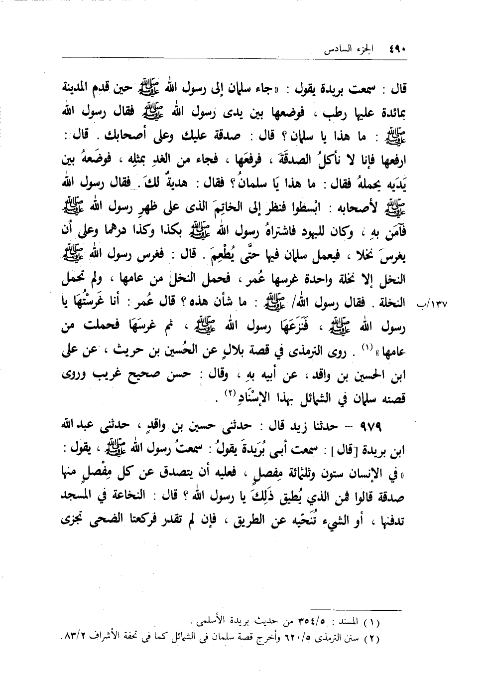 قال: سمعت بريدة يقول: (جاء سلمان إلى رسول الله - صلى الله عليه وسلم - حين قدم المدينة بمائدة عليها رطب، فوضعها بين يدي رسول الله - صلى الله عليه وسلم - فقال رسول الله - صلى الله عليه وسلم -: ما هذا يا سلمان؟ قال: صدقة عليك وعلى أصحابك. قال: ارفعها فإنا لا نأكلُ الصدقة، فرفعها، فجاء من الغدِ بمثلهِ، فوضعهُ بين يديه يحملهُ فقال: ما هذا يا سلمانُ؟ فقال: هديةٌ لكَ. فقال رسول الله - صلى الله عليه وسلم - لأصحابه: ابْسطوا فنظر إلى الخاتم الذي على ظهر رسول الله - صلى الله عليه وسلم - فآمن بهِ، وكان لليهود فاشتراهُ رسول الله - صلى الله عليه وسلم - بكذا وكذا درهما وعلى أن يغرسَ نخلاً، فيعمل سلمان فيها حتى يُطعِمَ. قال: فغرس رسول الله - صلى الله عليه وسلم - النخل إلا نخلة واحدة غرسها عُمر، فحمل النخل من عامها، ولم تحمل النخلة. فقال رسول الله / - صلى الله عليه وسلم -: ما شأن هذه؟ قال عُمر: أنا غرستُها يا رسول الله - صلى الله عليه وسلم -، فنزعها رسول الله - صلى الله عليه وسلم -، ثم غرسها فحملت من عامها) (¬1) . روى الترمذي في قصة بلالٍ عن الحُسين بن حريث، عن علي بن الحسين بن واقد، عن أبيه بهِ، وقال: حسن صحيح غريب وروى قصته سليمان في الشمائل بهذا الإسنادِ (¬2) .