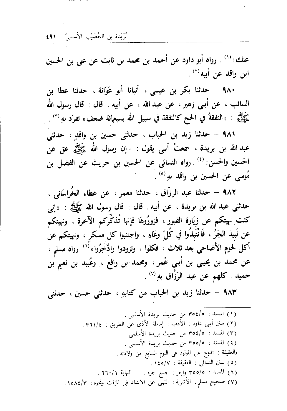 981 - حدثنا زيد بن الحباب، حدثني حسين بن واقدٍ، حدثني عبد الله بن بريدة، سمعتُ أبي يقول: (إن رسول الله - صلى الله عليه وسلم - عق عن الحسين والحسن) (¬2) . رواه النسائي عن الحسين بن حريث عن الفضل بن موسى عن الحسين بن واقد بهِ (¬3) .