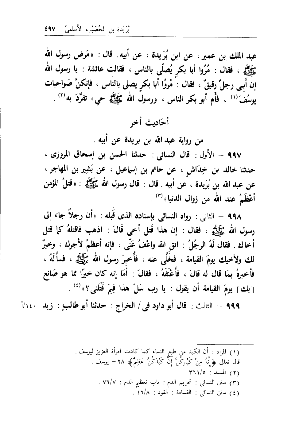 997 - الأول: قال النسائي: حدثنا الحسن بن إسحاق المروزي، حدثنا خالد بن خِدَاشٍ، عن حاتم بن إسماعيل، عن بشير بن المهاجر، عن عبد الله بن بُريدة، عن أبيه. قال: قال رسول الله - صلى الله عليه وسلم -: (قتلُ المؤمن أعظمُ عند الله من زوال الدنيا) (¬1) .