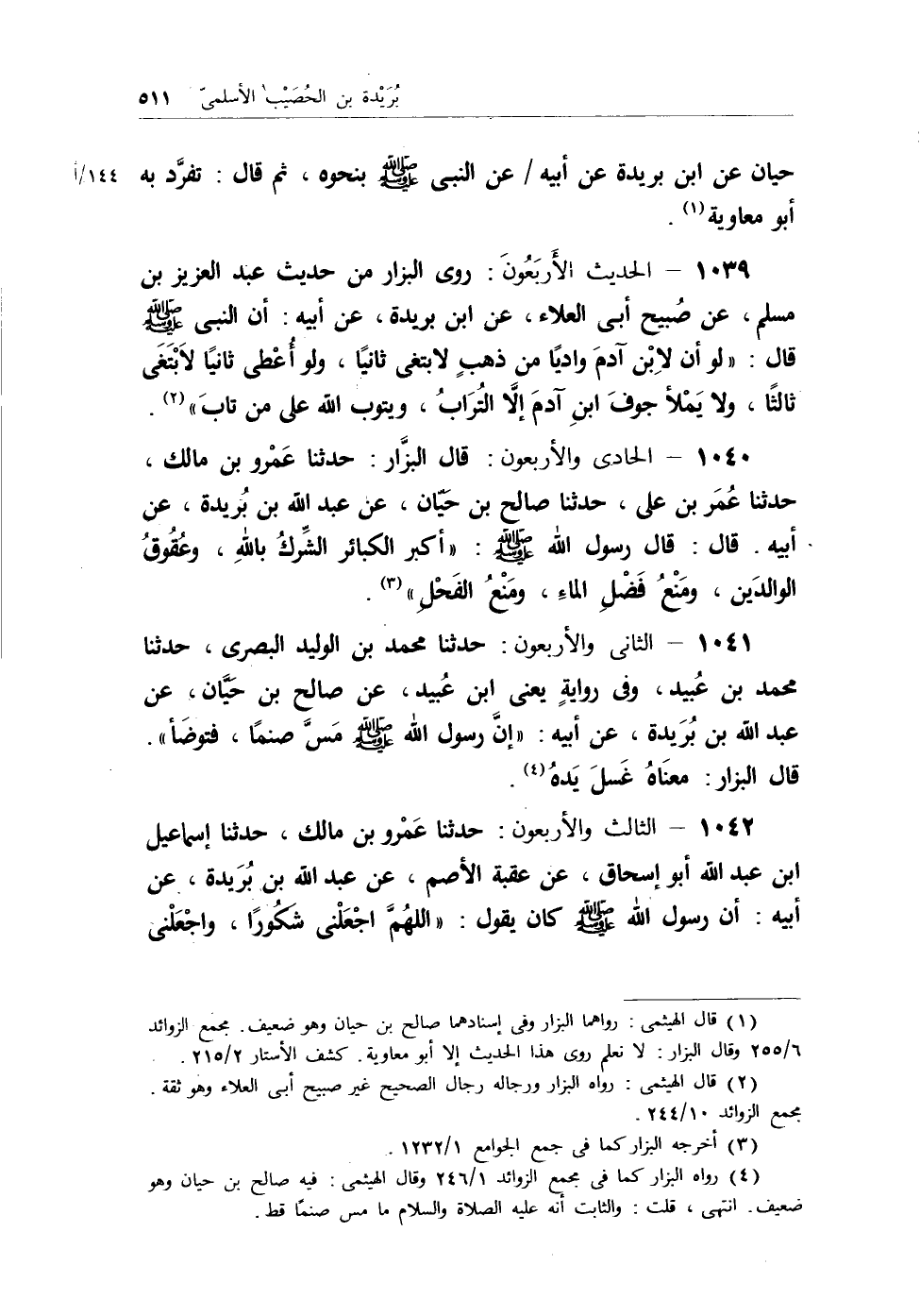 1041 - الثاني والأربعون: حدثنا محمد بن الوليد البصري، حدثنا محمد ابن عُبيد، وفي روايةٍ يعني ابن عُبيد، عن صالح بن حيَّان، عن عبد الله بن بُريدة، عن أبيه: (إنَّ رسول الله - صلى الله عليه وسلم - مَسَّ صنماً، فتوضأ) . قال البزار: معناهُ غسلَ يدهُ (¬3) .