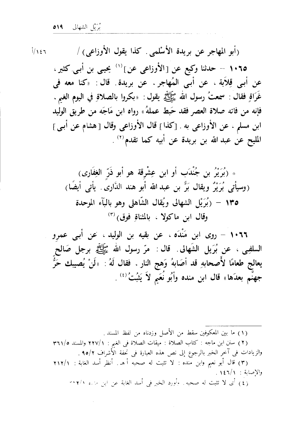 1066 - روى ابن منده، عن بقيه بن الوليد، عن أبي عمرو السلفي، عن بُريل الشهالي. قال: مرّ رسول الله - صلى الله عليه وسلم - برجل صالح يعالج طعاماً لأصحابهِ قد أصابهُ وَهج النار. فقال لهُ: (لنْ يُصيبك حرُّ جهنم بعدها) قال ابن منده وأبو نعيم لا يثبتُ (¬4) .