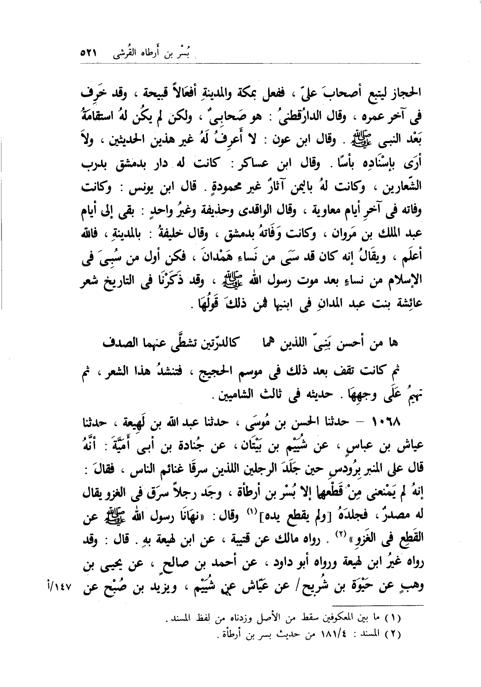 1068 - حدثنا الحسن بن مُوسى، حدثنا عبد الله بن لهيعة، حدثنا عياش ابن عباسٍ، عن شُييم بن بيتان، عن جُنادة بن أبي أَميَّةَ: أنَّهُ قال على المنبر بِرُودسِ حين جَلَدَ الرجلين اللذين سرقا غنائم الناس، فقالَ: إنهُ لم يمنعني من قطعهما إلا بُسْر ابن أرطأة، وجد رجلاً سرق في الغزو يقال له مصدرٌ، فجلدهُ [ولم يقطع يده] (¬1) وقال: (نهانا رسول الله - صلى الله عليه وسلم - عن القَطِع في الغَزوِ) (¬2) . رواه مالك عن قتيبة، عن ابن لهيعة بهِ. قال: وقد رواه غيرُ ابن لهيعة ورواه أبو داود، عن أحمد بن صالحٍ، عن يحيى ابن وهبٍ عن حيوةَ بن شُريح/ عن عياش عن شُيَيْم، ويزيد بن صُبح عن