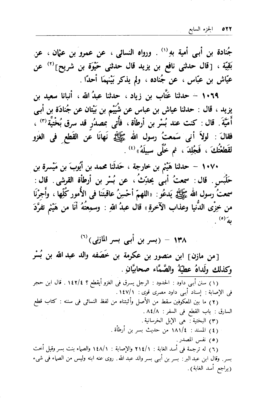 1069 - حدثنا عَتَّاب بن زياد، حدثنا عبد الله، أنبأنا سعيد بن يزيد، قال: حدثنا عياش بن عباس عن شُيَيْم بن بَيْتان عن جُنادة بن أبي أَمَيَّةَ. قال: كنت عند بُسْر بن أرطأة، فأُتي بمصدُرٍ قد سرق بُخْتِّية (¬1) ، فقالَ: لولاَ أني سمعتُ رسول الله - صلى الله عليه وسلم - نَهانا عن القطعِ في الغزو لقطعتُكَ، فجُلِدَ، ثم خُلِّي سبيلهُ) (¬2) .