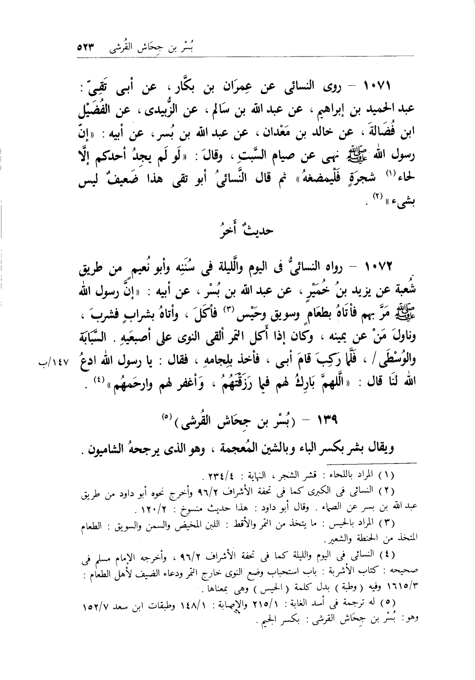 (¬5) له ترجمة في أسد الغابة: 1/215 والإصابة: 1/148 وطبقات ابن سعد 7/152 وهو: بُسْر بن جِحَاش القرشي: بكسر الجيم.