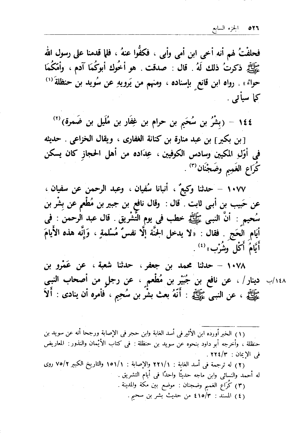 1077 - حدثنا وكيعٌ، أنبأنا سُفيان، وعبد الرحمن عن سفيان، عن حبيب ابن أبي ثابت. قال: وقال نافع بن جبير بن مُطعم عن بِشْر بن سُحيمٍ: أنَّ النبي - صلى الله عليه وسلم - خطب في يوم التَّشريق. قال عبد الرحمن: في أيام الحج. فقال: (لا يدخل الجنَّة إلاَّ نفسٌ مُسْلمةٍ، وإنَّه هذه الأيام أَيامُ أَكْل وشُرْب) (¬3) .